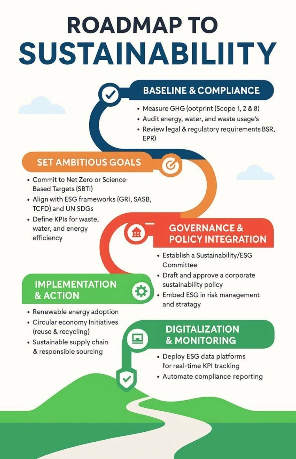 진단(기준선/규제) 목표(넷제로·SBTi·KPI) 체계(위원회·정책·리스크통합) 실행(에너지·순환·공급망) 상시관리(플랫폼·자동보고)