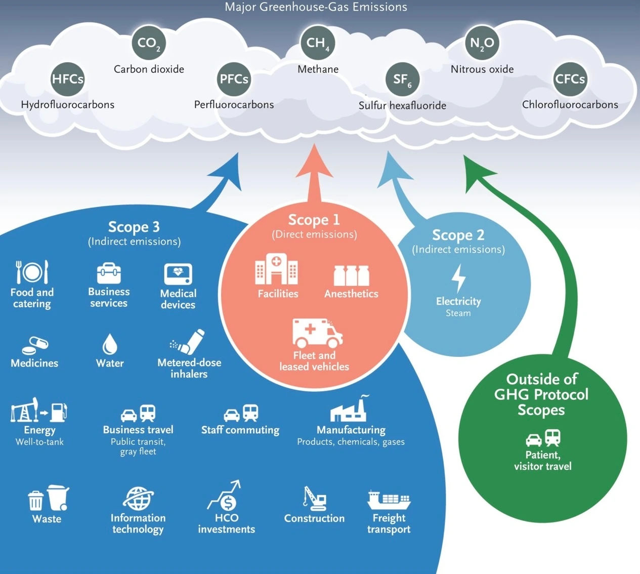 이미지에서는 Patient, visitor travel(환자·방문객 이동)을 “GHG Protocol 스코프 밖”으로 별도 표기합니다.