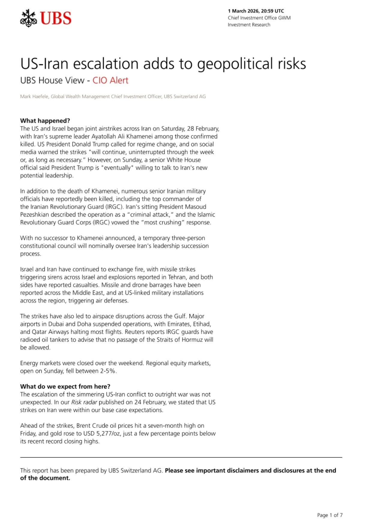 • UBS Switzerland AG, Chief Investment Office GWM, “US-Iran escalation adds to geopolitical risks (UBS House View – CIO Alert)”, 1 March 2026.