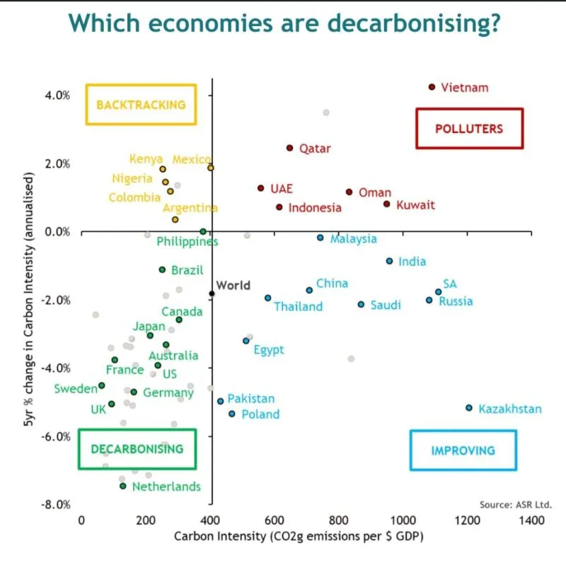 최근 분석은 탄소 집약도와 변화율에 따라 국가를 분류합니다.