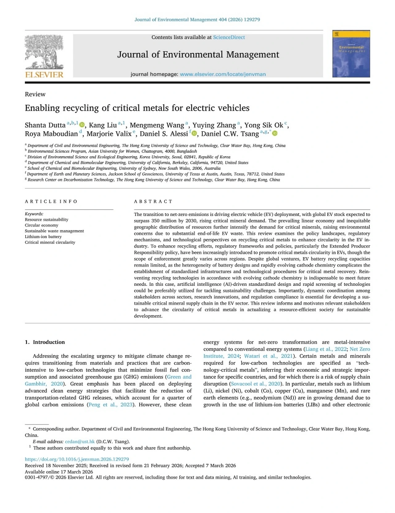 Dutta, S., Liu, K., Wang, M., Zhang, Y., Ok, Y. S., Maboudian, R., Valix, M., Alessi, D. S., & Tsang, D. C. W. (2026). Enabling recycling of critical metals for electric vehicles. Journal of Environmental Management, 404, 129279.