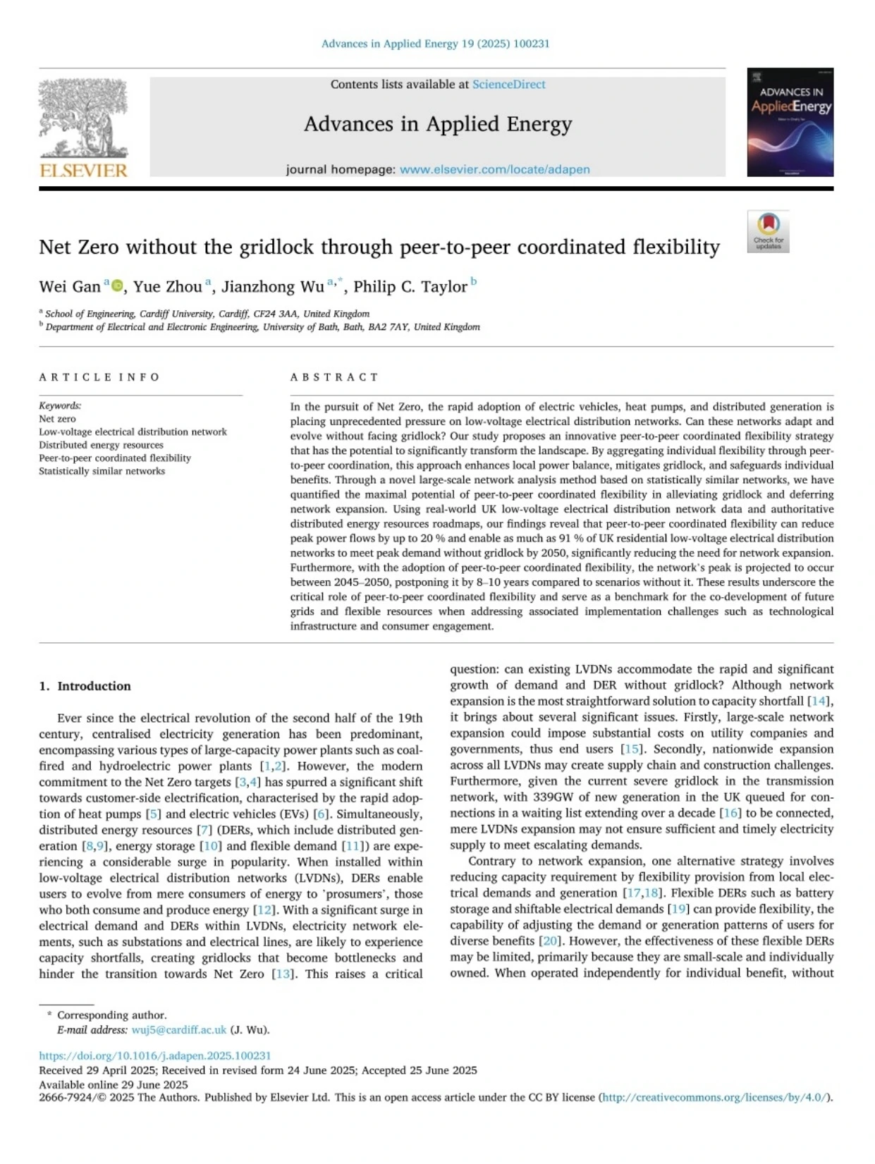 • Wei Gan, Yue Zhou, Jianzhong Wu, Philip C. Taylor, “Net Zero without the gridlock through peer-to-peer coordinated flexibility,” Advances in Applied Energy, Vol. 19, 2025, 100231. DOI: 10.1016/j.adapen.2025.100231.