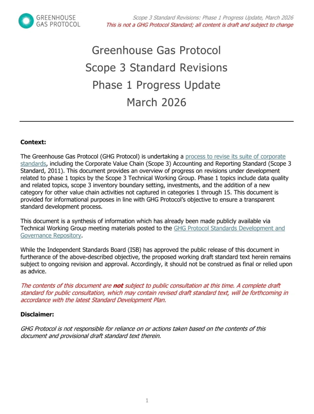 Greenhouse Gas Protocol, Scope 3 Standard Revisions: Phase 1 Progress Update, March 2026.