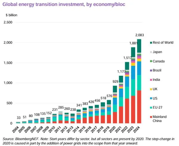 • 2024년 투자 규모는 약 1조 달러에 육박 글로벌 에너지 전환의 중심 역할 수행.