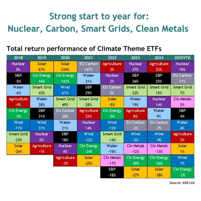 이 표는 2018년부터 2025년 현재(YTD, 연초 대비 수익률 기준)까지의 기후 테마 ETF(Climate Theme ETFs) 수익률을 연도별로 비교한 것이다.