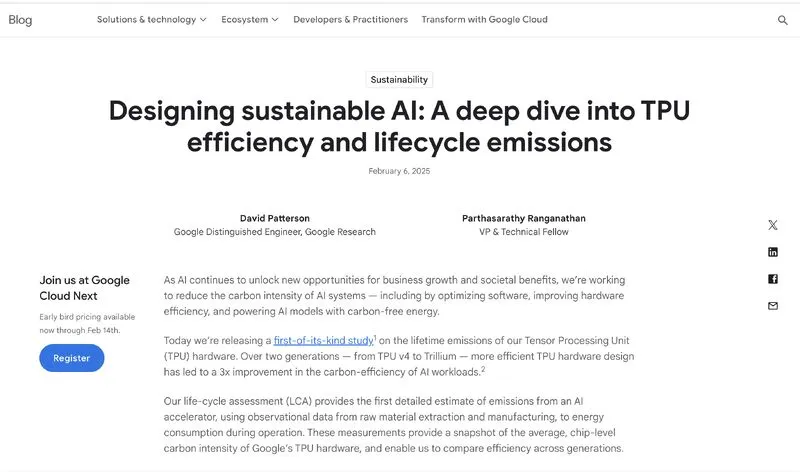 • Google은 TPU 하드웨어의 전체 수명 주기에 걸친 배출량을 평가하는 **최초의 연구(first-of-its-kind study)**를 발표.