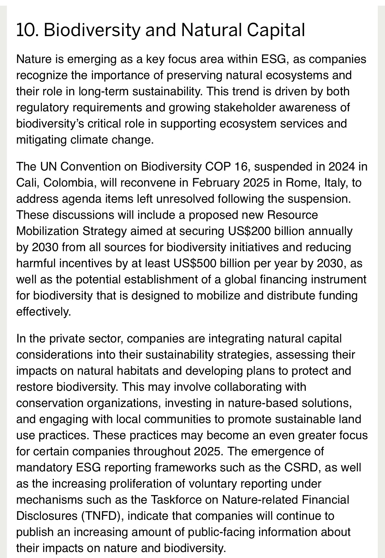 • 자연 관련 ESG 공시 증가: 기업들은 자연 관련 재무공시 태스크포스(TNFD)를 통해 자연 자본과 생물다양성에 대한 공개 요구 증가.