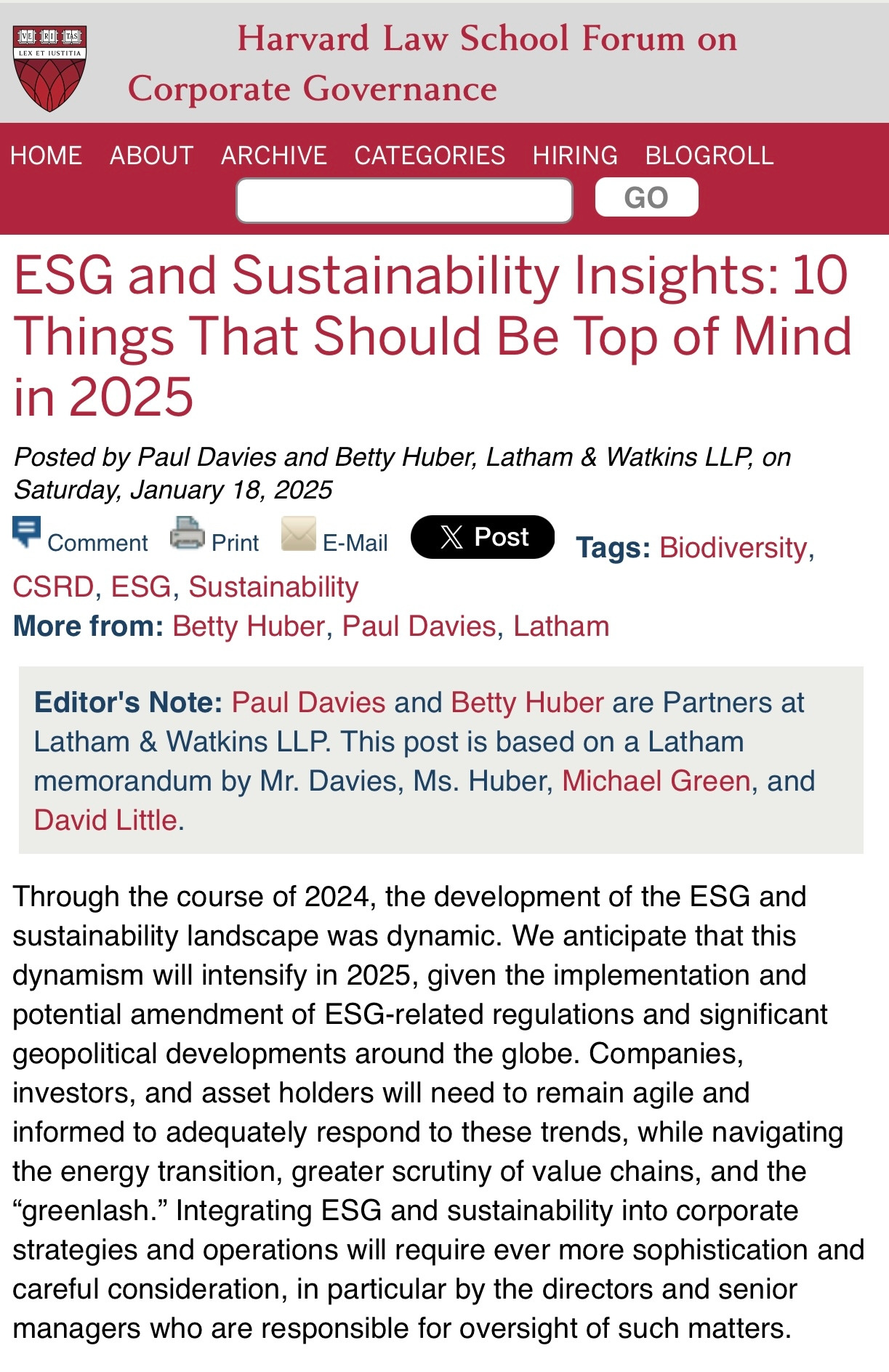 Harvard Law School Forum on Corporate Governance, ESG and Sustainability Insights: 10 Things That Should Be Top of Mind in 2025, Paul Davies & Betty Huber, Latham & Watkins LLP, 2025년 1월 18일.
