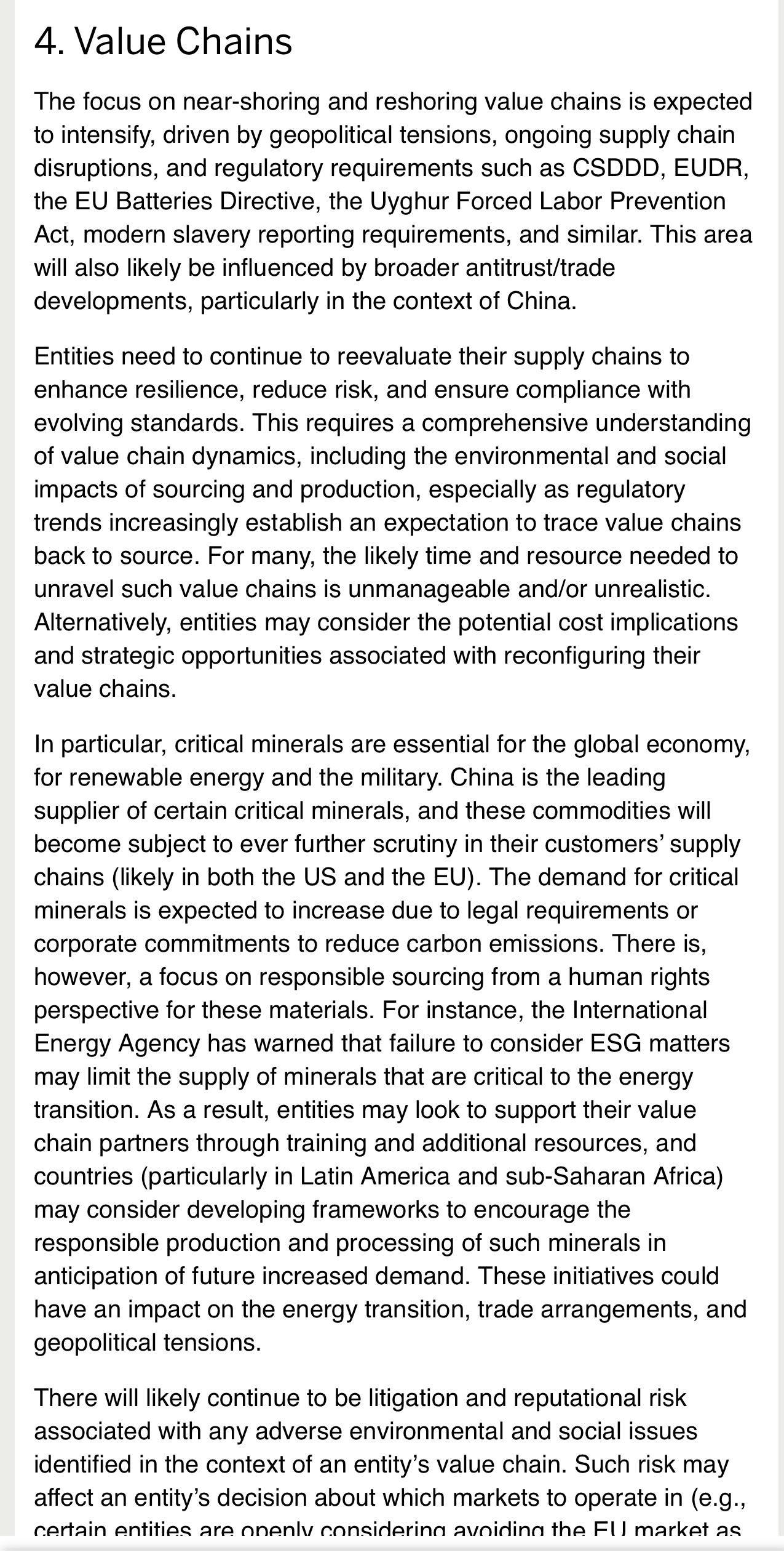 • 지정학적 긴장과 ESG 규제 증가: CSDDD, EUDR, 위구르 강제노동 예방법 등으로 인해 기업들의 밸류체인 재편 움직임이 증가할 전망.