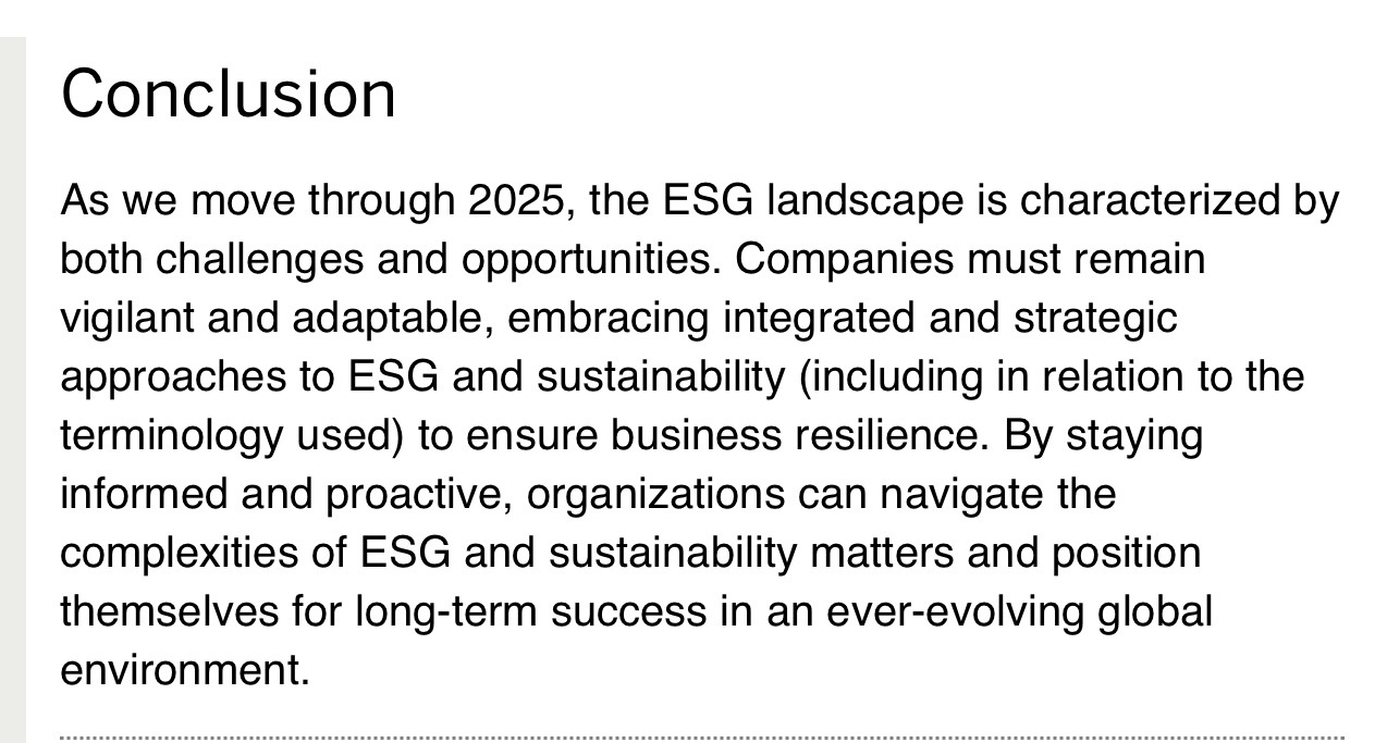 2025년의 ESG 환경은 도전과 기회가 공존하는 시기가 될 전망이다. 기업들은 민첩성과 적응력을 유지해야 하며, ESG 전략을 비즈니스 운영과 통합하는 것이 점점 더 중요해지고 있다. 지속가능성 공시 의무화, 기후 변화 대응, AI 활용, 가치사슬 재편 등 다양한 요소를 고려한 전략적 접근이 요구된다. ESG 이슈를 선제적으로 대응하는 기업이 장기적으로 경쟁 우위를 확보할 것으로 예상된다.
