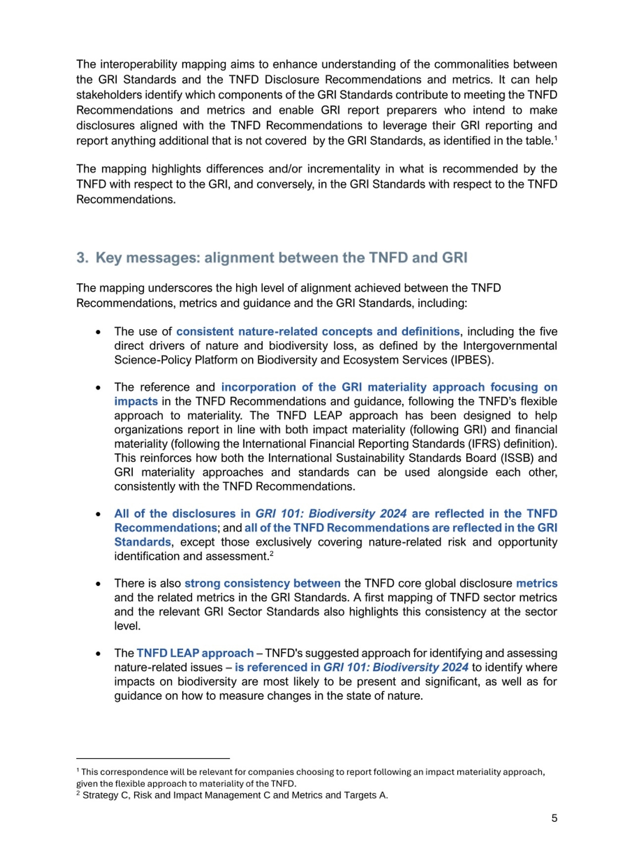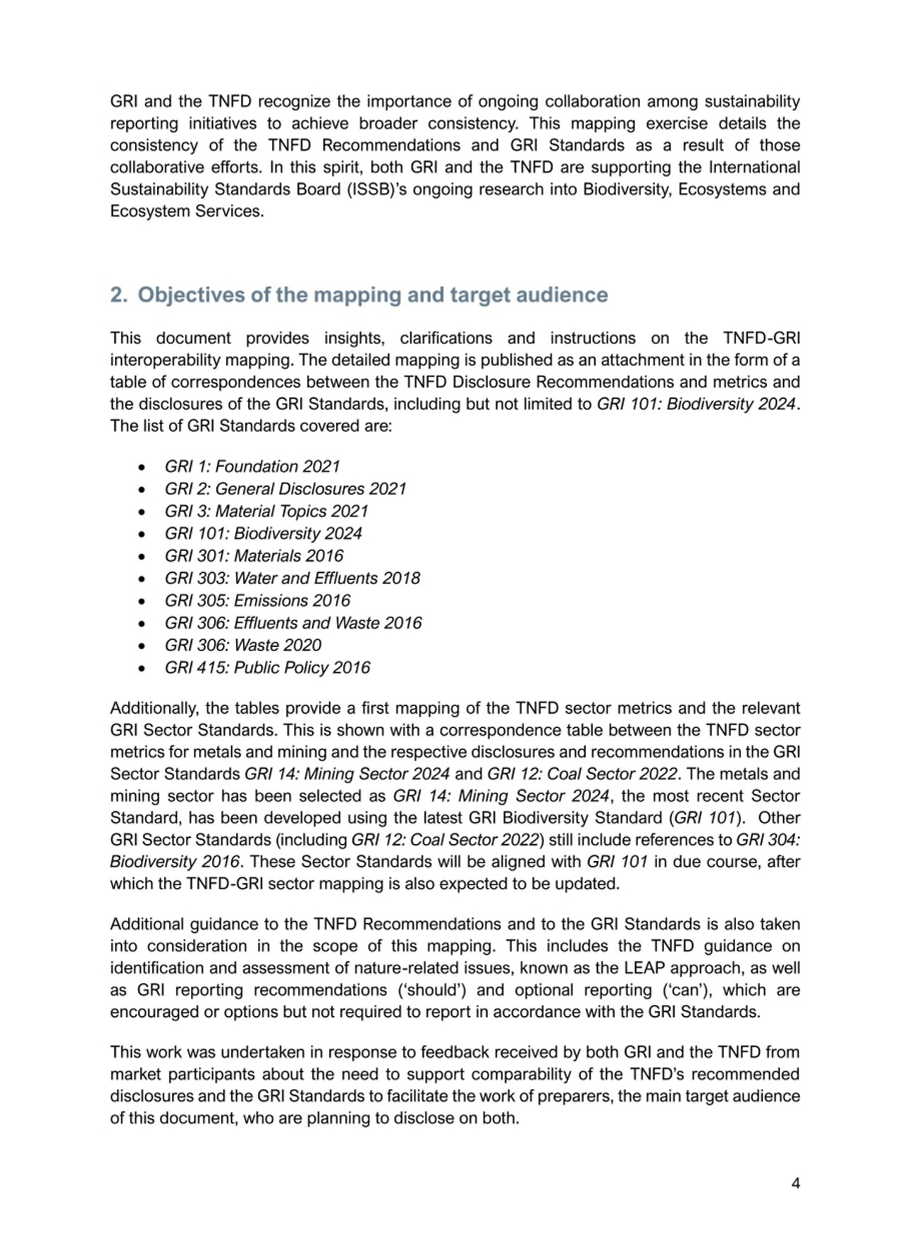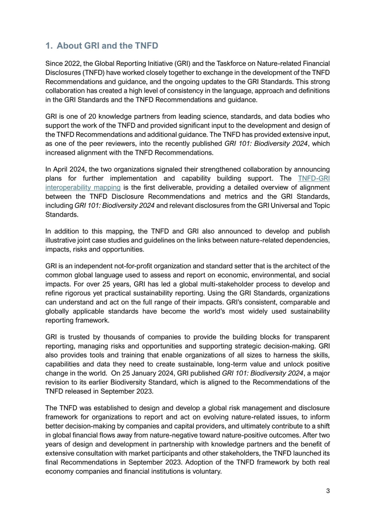 2024년 4월, 두 기관은 협력을 강화하여 TNFD-GRI 상호운용성 매핑(interoperability mapping)을 발표