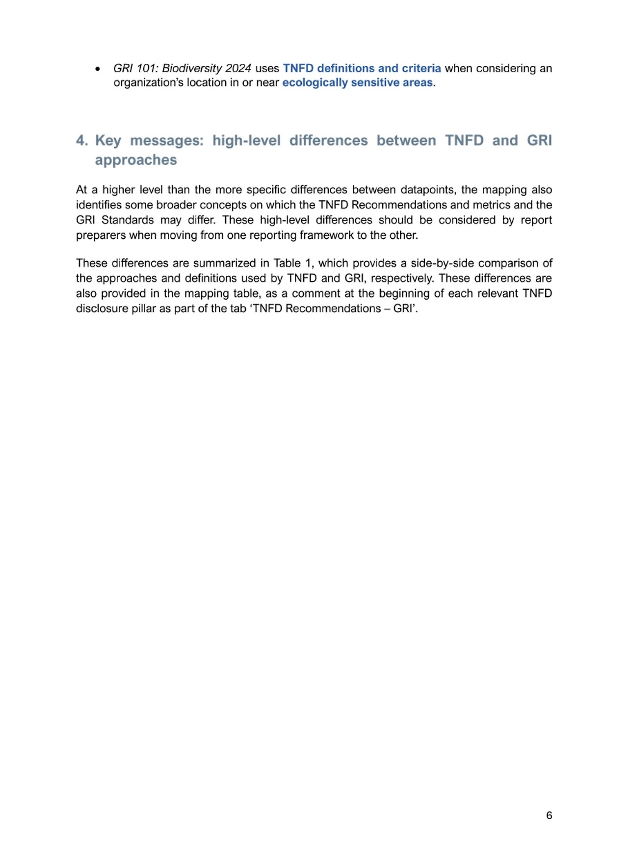 TNFD와 GRI 간의 매핑은 두 기관의 권고안과 표준이 높은 수준에서 일치함을 강조하며, 주요 메시지는 다음과 같음.