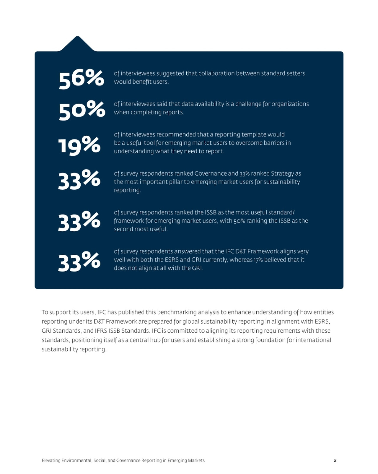 결과적으로, IFC는 신흥 시장에서 ISSB 및 ESRS 표준을 도입할 수 있도록 지원하며, 기업의 ESG 보고 능력을 향상시키는 역할을 수행함.