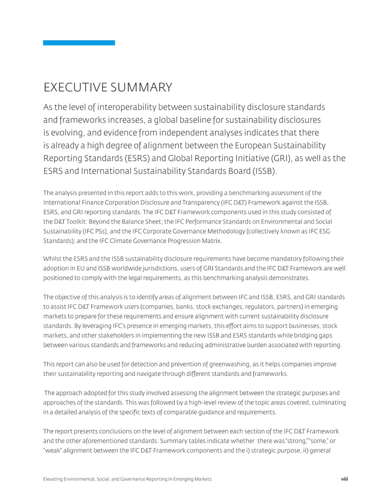 본 보고서는 IFC의 공시 및 투명성(Disclosure & Transparency, D&T) 프레임워크가 글로벌 지속가능성 공시 표준과 어떻게 정렬되는지 분석하기 위해 작성됨.