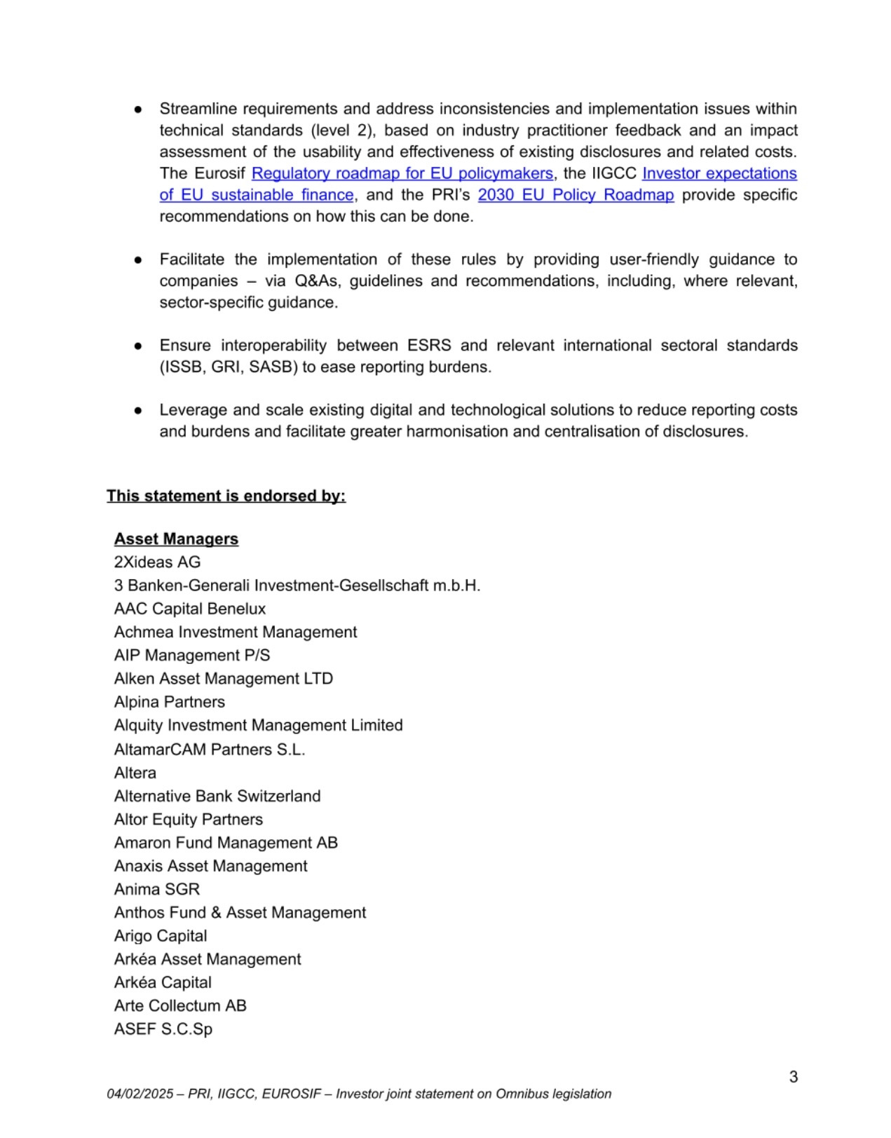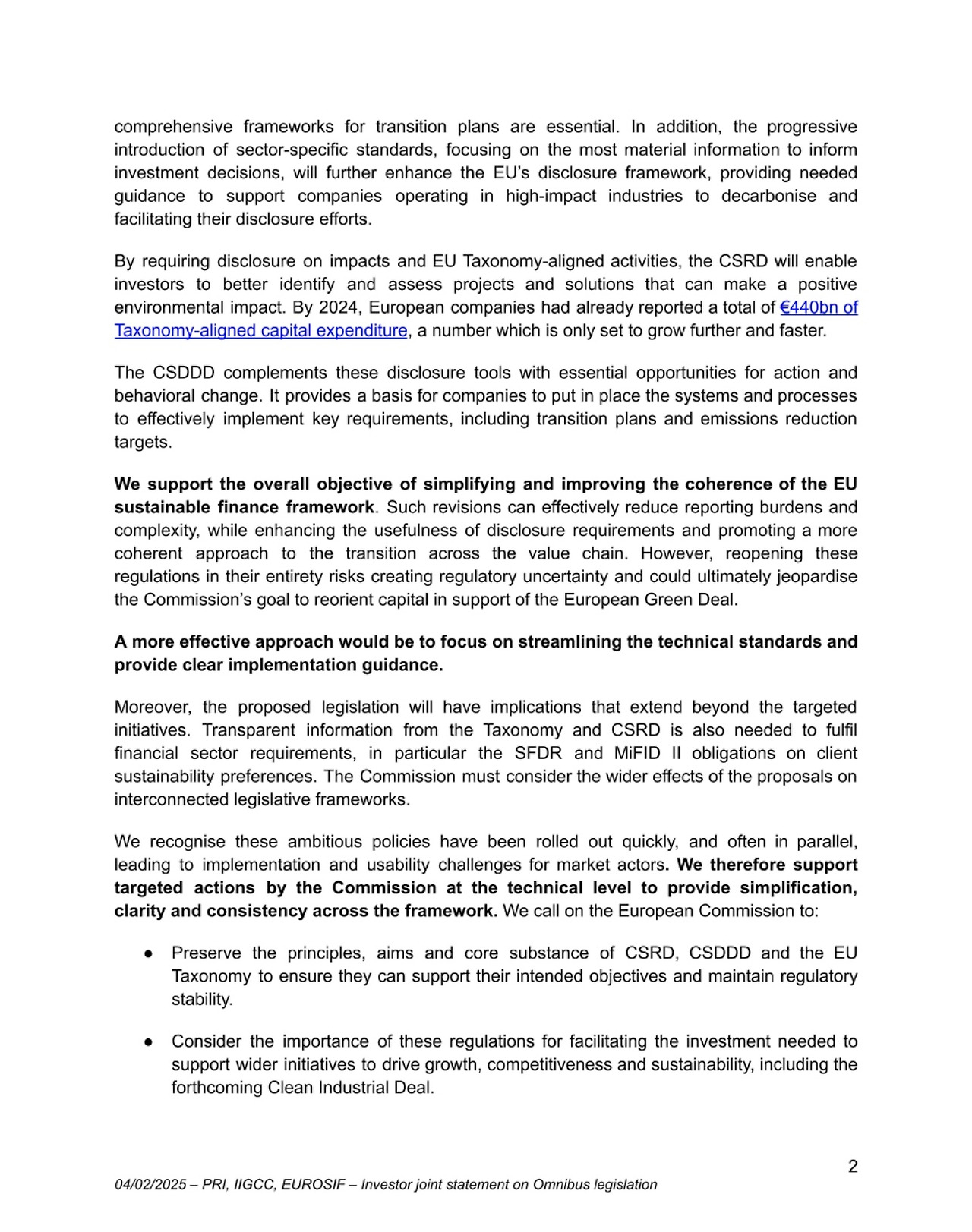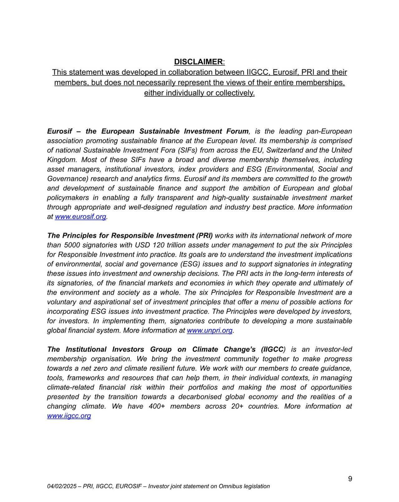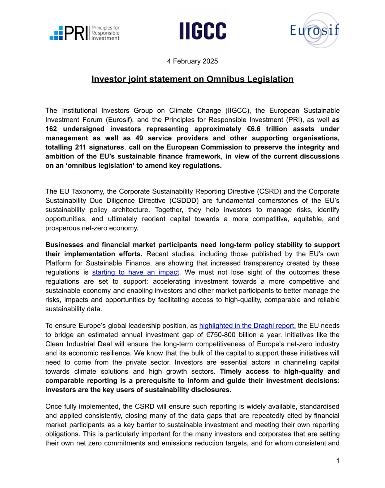 PRI, IIGCC, Eurosif – Investor Joint Statement on Omnibus Legislation (2025년 2월 4일 발표)