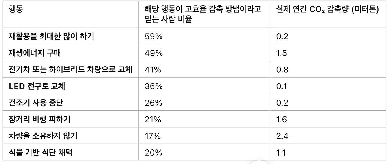 잘못된 인식 vs. 실제 CO₂ 배출량 절감 효과