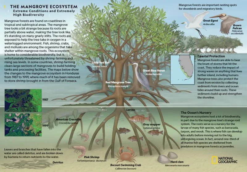 맹그로브 숲은 열대 및 아열대 지역의 해안선에서 발견되며, 극한 환경에서도 높은 생물 다양성을 보인다. 맹그로브 나무는 부분적으로 물 위에 뿌리를 드러내고 있어 마치 물 위에 떠 있는 듯한 모습이다. 이 뿌리들은 산소 공급을 돕고, 물이 많은 환경에서도 살아갈 수 있도록 한다. 맹그로브 숲은 물고기, 새우, 게, 연체동물 등의 서식지 역할을 하며, 다양한 해양 생물에게 은신처를 제공한다.
