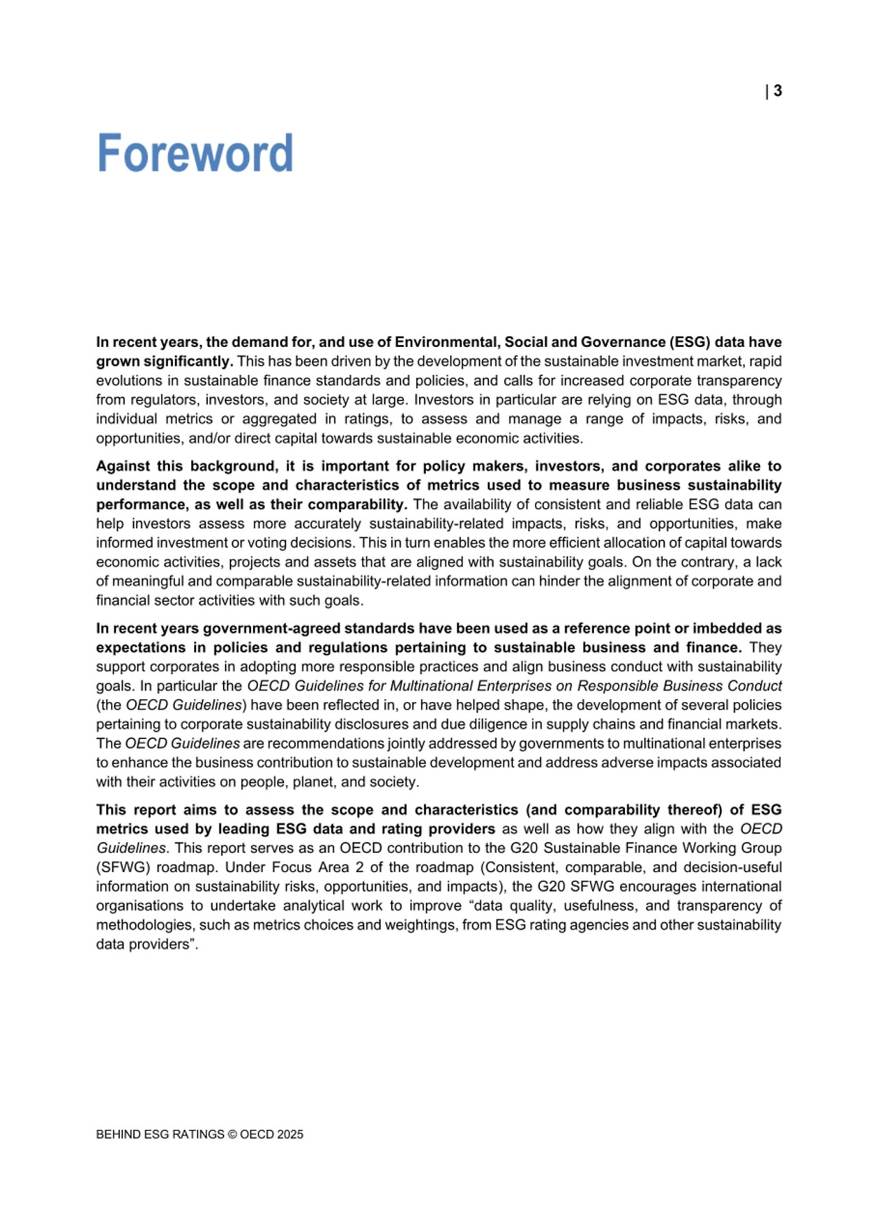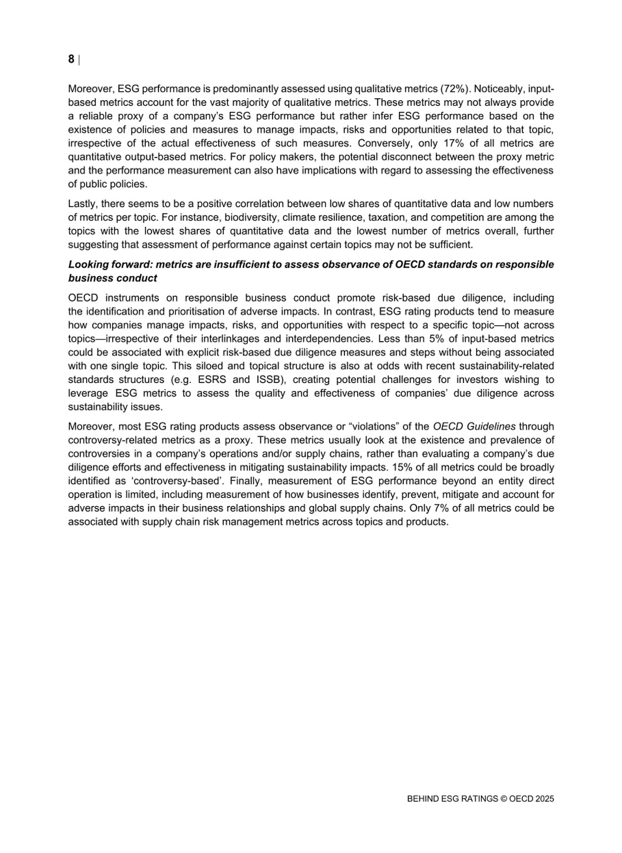1️"사용 가능한 지표는 일반적으로 OECD 가이드라인의 권고 사항 준수 여부를 측정하기에 충분하지 않다"라며, 이는 단순히 운영 및 공급망에 위험이 있거나 부정적인 영향을 미친다는 이유로 기업에 불이익을 줄 위험이 있는 논란 기반 지표에 의존하고, 직접 운영(예: 공급망 및 기타 비즈니스 관계)을 넘어서는 정책 및 성과에 대한 적용 범위가 매우 제한적이며, 특정 주제에 대해서만 실사 조치를 포착하는 경우가 많다"고 밝혔다.