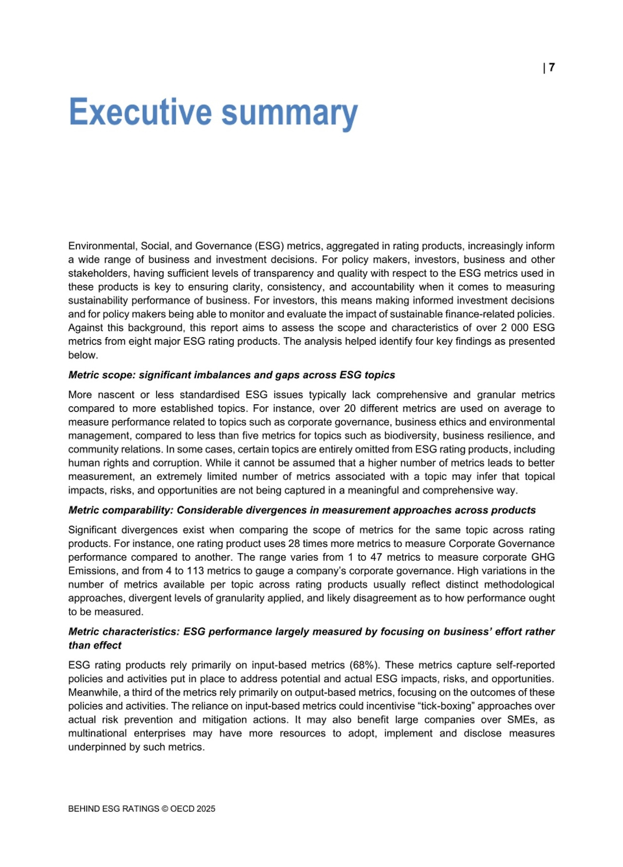 4️"ESG 평가 상품은 주로 입력 기반 지표(68%)에 의존합니다. (...) 입력 기반의 자체 보고 지표는 기업이 공급망 및 공개 관행을 넘어 전체적으로 영향, 위험 및 기회를 효과적으로 관리하는 방법에 대한 정보가 제한된 상태에서 부분적인 ESG 성과 평가로 이어질 수 있습니다."