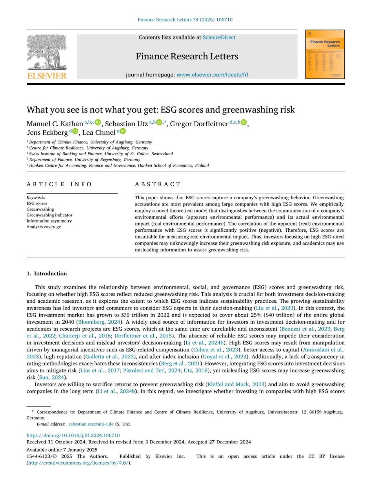 • Kathan, M. C., Utz, S., Dorfleitner, G., Eckberg, J., & Chmel, L. (2025). What you see is not what you get: ESG scores and greenwashing risk. Finance Research Letters, 74, 106710. DOI: 10.1016/j.frl.2024.106710.