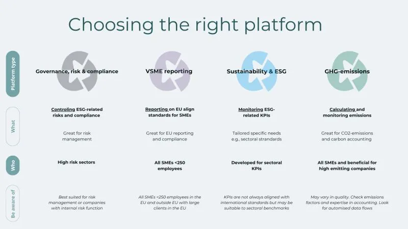 기업의 ESG 전략에 따라 플랫폼을 선택해야 하며, 특히 규제 준수, 리스크 관리, ESG 목표 달성, 배출량 감축 등의 주요 목적에 맞춰 적절한 솔루션을 고려하는 것이 중요하다.