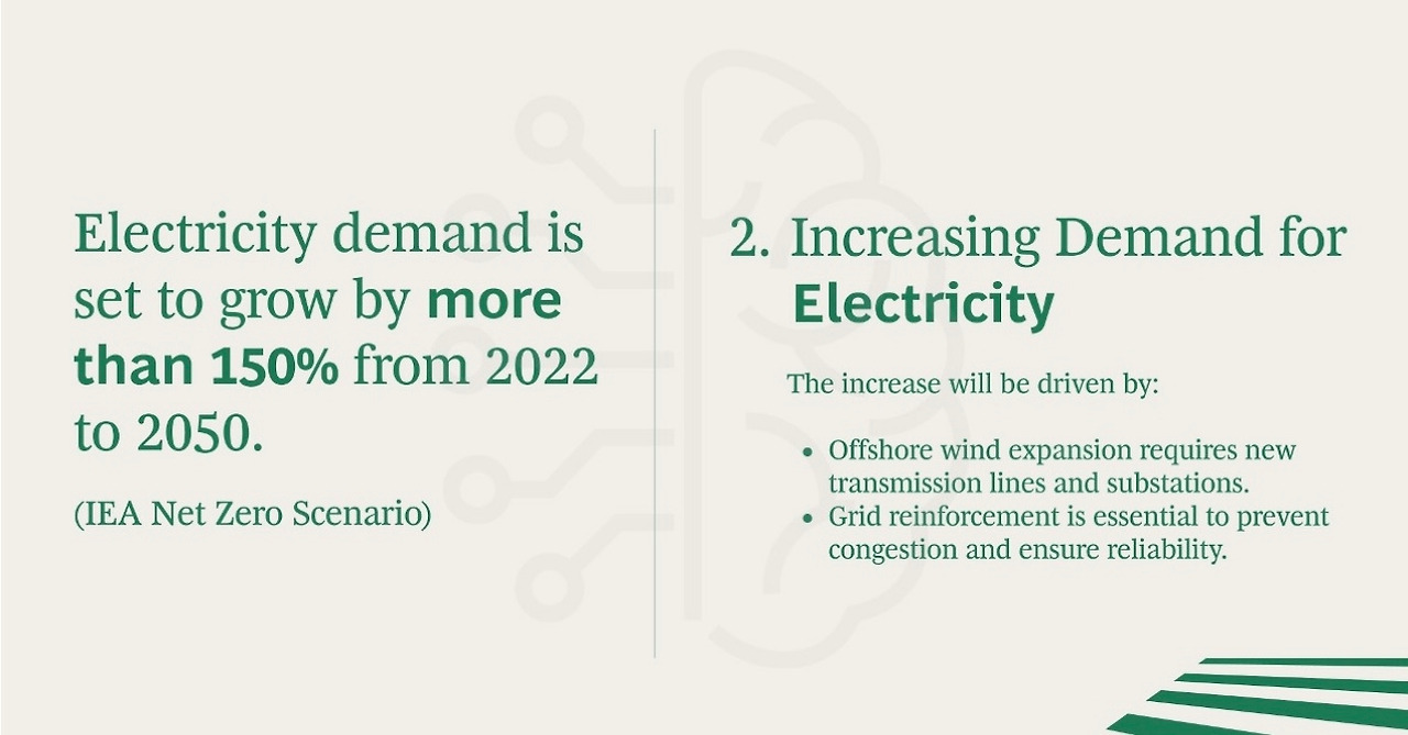 • 해상풍력 발전 확대에 따른 새로운 송전망 및 변전소 건설 필수.