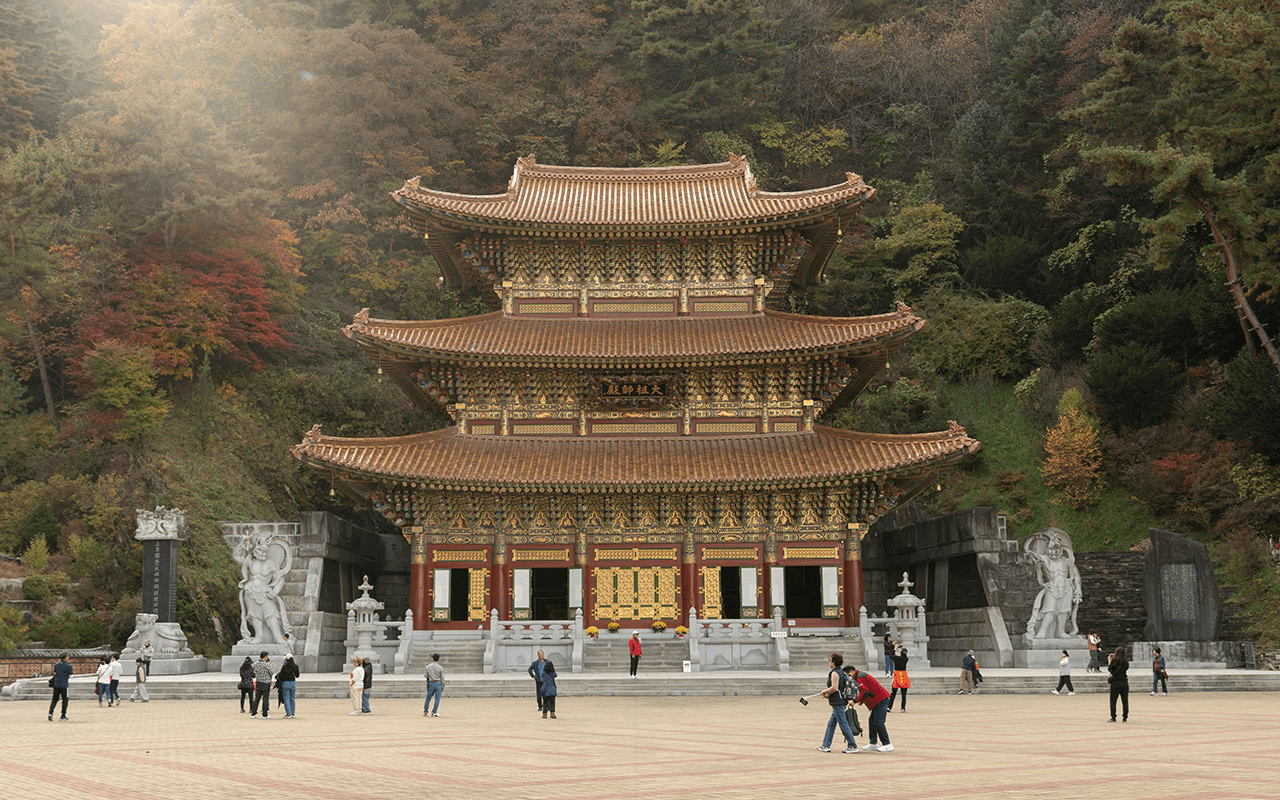 협소한 계곡 지형을 따라 솟아오른 50여 채의 전각들은 대부분 3층에서 6층 높이의 현대식 빌딩 구조를 취하고 있습니다.