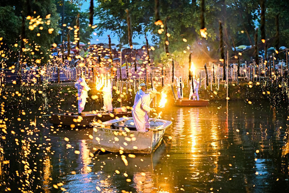 길게 늘어뜨린 낙화봉 하나하나에 불을 붙이면, 불꽃이 바람을 타고 연못 위로 흩어진다.