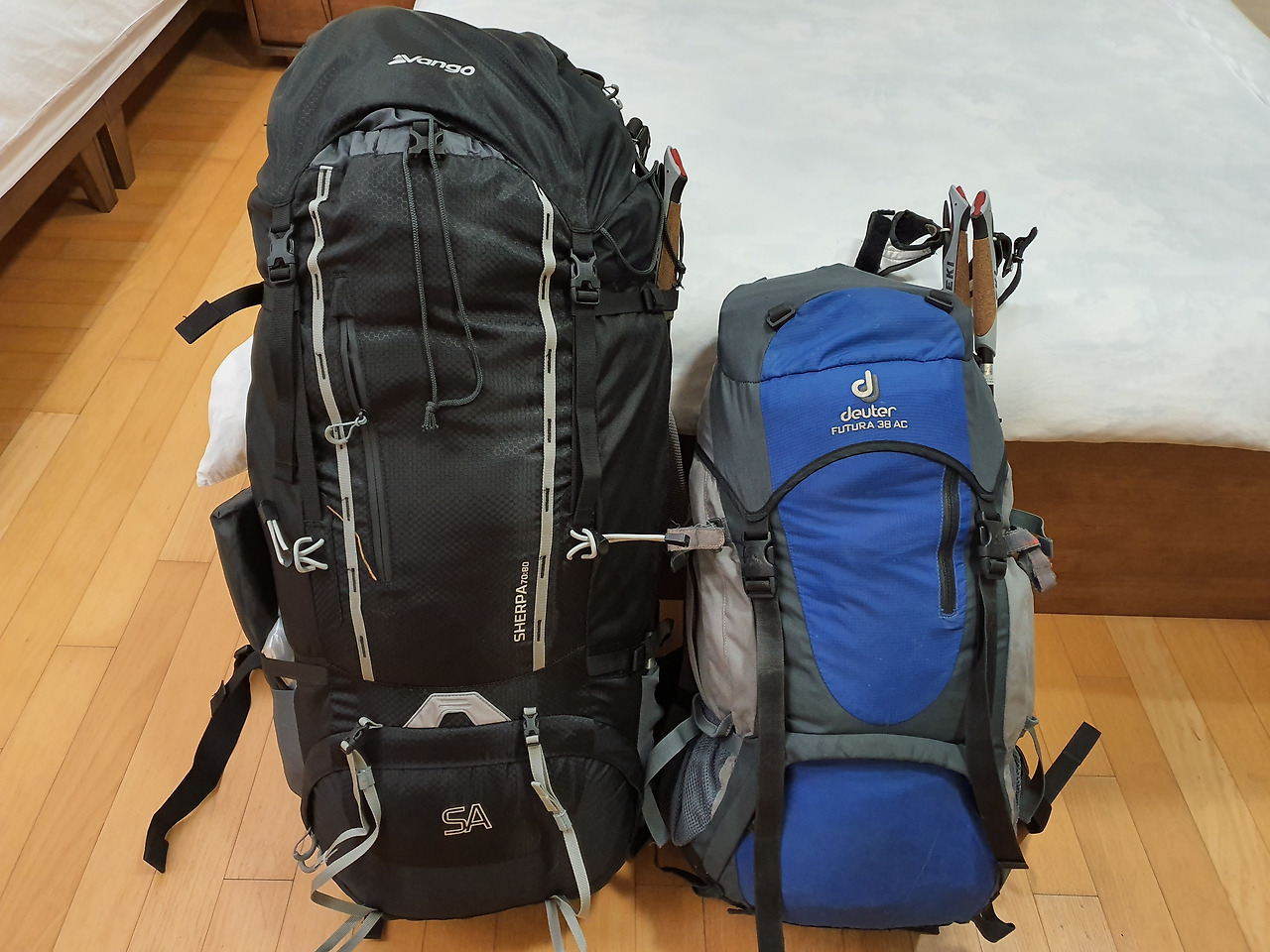 어쨌거나 이런저런 물품들을 챙겨보니 아내의 배낭은 12kg, 내 배낭은 18kg이다. 여행기를 보니 배낭 무게가 체중의 1/10, 최대 10kg를 넘지 않아야 한다는 말이 좀 걸리기는 하지만, 문제는 뭐 뺄 것이 없다. 80 리터 배낭에 짐을 머리 위까지 구겨 넣어 등에 져 보니 듬직하니 견딜만하다. 아내에게 큰소리쳤다. 여보, 이거 별거 아니네. 걸을 수 있겠어. 아무렴, 내가 누군가? 젊을 때는 30kg 배낭에 손에는 물통까지 들고 산으로 다녔는데 이 정도는 약과지.
