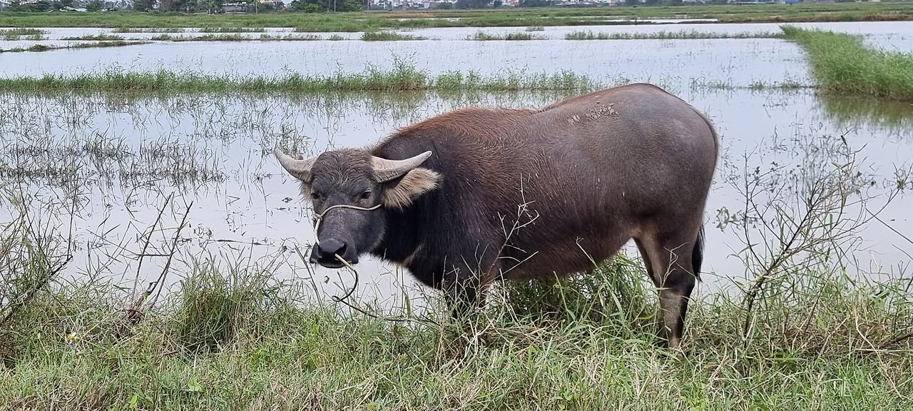 20여분을 걸으니 갑자기 시야가 확 터진다. 주택가 골목길이 끝나는 지점에 넓은 논들이 허허벌판을 이루고 있다. 어디선가 꽥꽥거리는 소리가 들려 눈을 돌려보니 수많은 오리들이 물이 그득한 논에서 정신없이 헤엄치며 자맥질을 해댄다. 혹시 내가 녀석들을 쫒는 건 아닐까, 그러나 가까이 다가가도 카메라를 들이대도 전혀 신경 쓰지 않는 걸로 봐서 야생오리가 아니라 사람들이 기르는 녀석들이다. 논 둑에는 여기저기 물소들이 풀을 뜯고 있다. 거무티티한 색깔에 휘어진 뿔을 매단 녀석들이 낯선 이방인을 멀뚱멀뚱 구경한다. 하기야 관광객들이 지나다닐 길도 아니니 한국사람을 처음 볼 수도 있겠구나, 너는 나를 구경하고 나는 너를 구경하자. 카메라를 꺼내도 여전히 멀뚱 멀뚱이다. 농가 옆을 지나는데 송아지 두 마리가 또 우리를 구경한다. 가까이 가도 도망은커녕 먼저 코를 들이대며 관심을 보인다. 잠시 코에 손을 대고 우리는 서로를 확인한다. 송아지는 내 손 냄새를 맡는 것으로, 나는 손으로 촉촉한 코의 감촉을 느끼는 것으로. 조금 떨어진 곳에서 걱정스럽게 바라보던 어미소도 안심했는지 멈추었던 되새김질을 하고 있다. 벼를 모두 수확했는지 논은 텅 비어있고 물만 그득하다. 수로의 풀과 나무에 빨간 무언가가 여기저기 매달려 있다. 무슨 열매인가 싶어서 가까이 가 보니 우렁이 알이다. 우렁이 껍데기가 나 뒹구는 걸로 봐서 수로와 논에 우렁이가 많다는 뜻이고 다시 말하자면 농약이나 화학비료를 덜 쓴다는 얘기다.