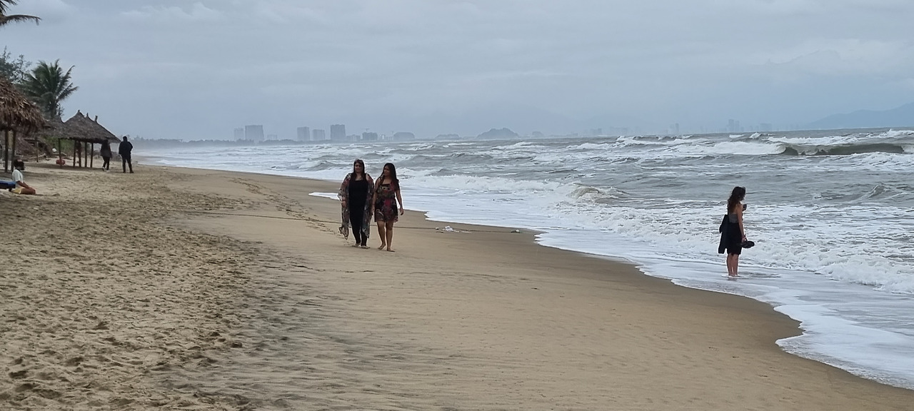 다리 쉼도 할 겸, 잠시 상가 테이블에 앉아 차를 마시며 바다를 바라본다. 베트남이라고는 해도 겨울인 데다가 날씨도 흐려서 선선한 편인데, 인도에서 온 듯한 여자 둘이 수영복을 입고 물에서 있다. 본전 생각이 나서 들어가긴 했지만 추우니 선뜻 수영은 못하고 있나 보다. 멀리 흐린 안갯속에 높은 건물들이 보이는데 마치 지구종말을 그린 공상과학영화에서 보았을 법한 괴기스러움이 느껴진다. 아내의 말로는 그곳이 바로 다낭이란다. 그 유명한 해수관음상이 쌀알만 하게 보이는 걸로 봐서 다낭이 맞다. 흠, 생각보다 멀지 않았군 싶다.