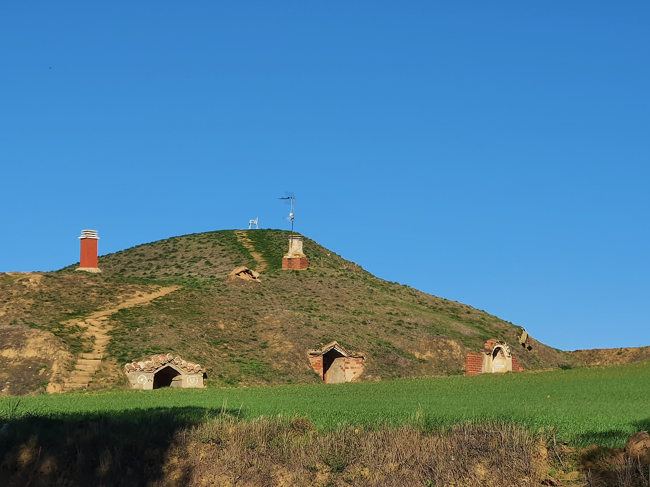 그런데 눈에 띄는 게 있다. 이 지역은 집들이 돌이 아니라 흙으로 지어져있다. 흙에 지푸라기를 썰어 바른 벽들이 마치 한국의 옛날 초가집 벽과 닮았다. 어쩌면 이 부근에는 돌이 귀했나보다. 괜히 정겹다. 눈길을 끄는 게 또 있다. 마치 옹기 가마를 이어 놓은 듯, 야트막한 언덕에 굴뚝들이 삐죽이 올라와 있다. 궁금해서 다가가보니 옛날 주민들이 살던 움집이란다. 지금은 와인 저장고로 쓰인다고 한다.