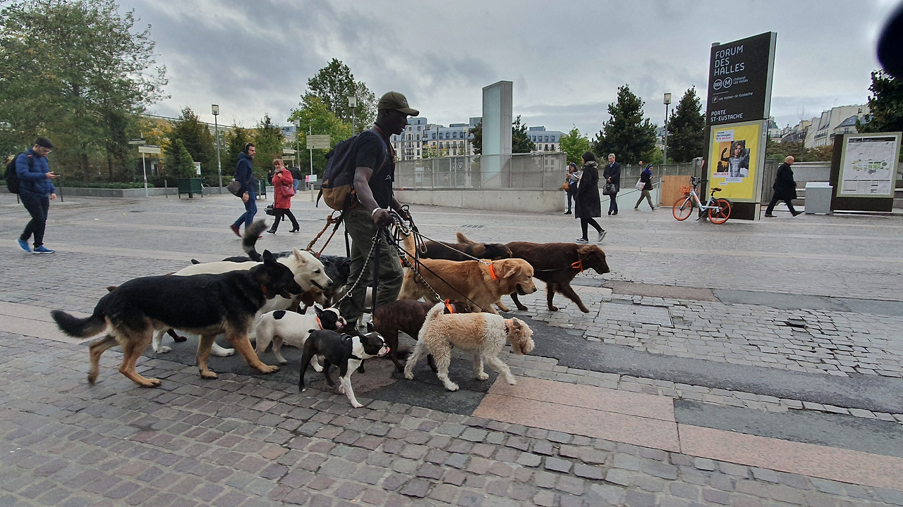 개를 산책시키는 직업이 있나보다. 개들이 일사분란, 군인같다.