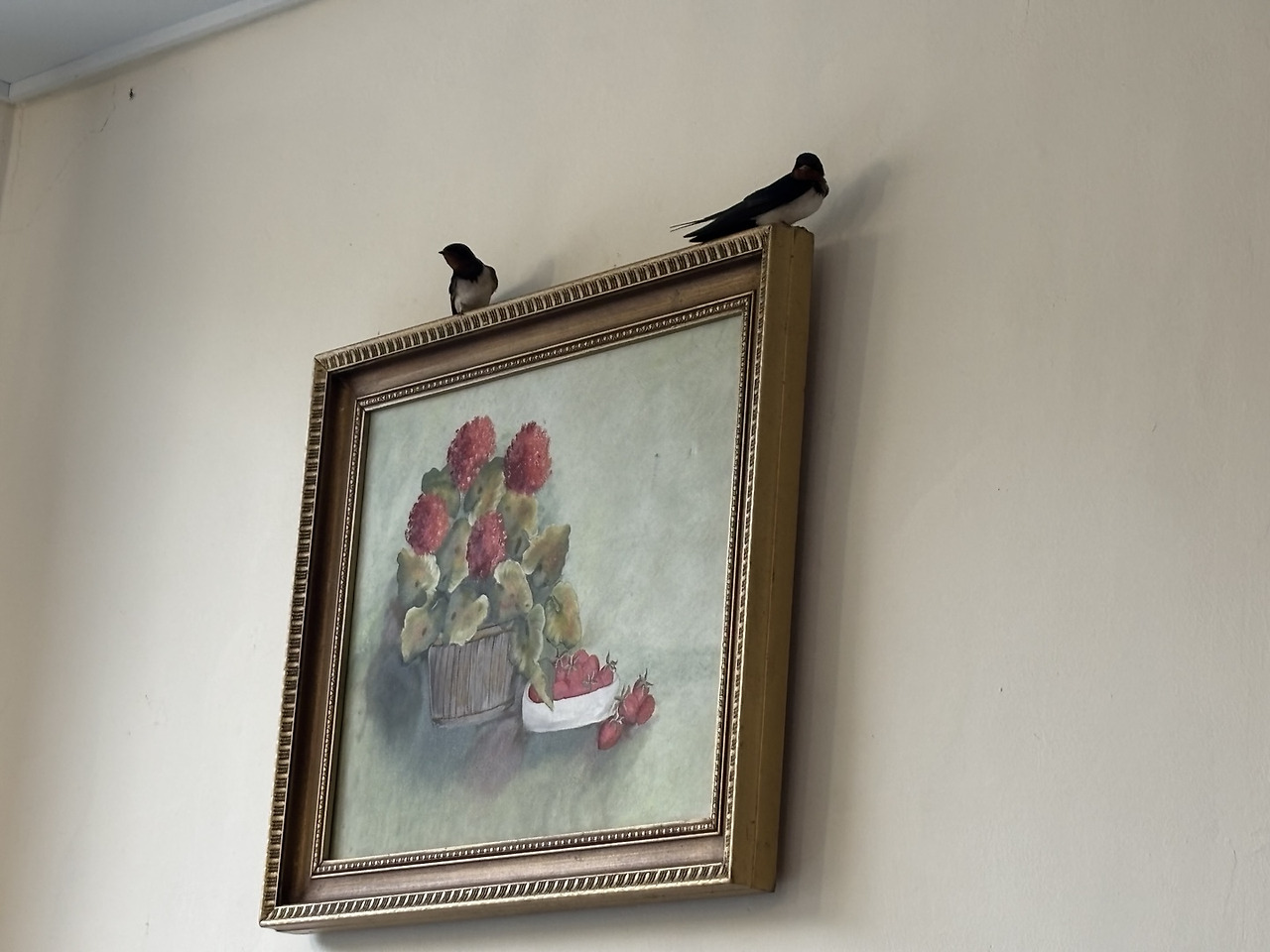 며칠이 지나자 두 가지 문제 모두 해결의 실마리를 찾았다. 제비가 징크 판넬의 2cm정도 되는 작은 턱에 의지해 기초를 쌓는 지혜를 발휘했고 이 공법은 성공했다. 며칠 만에 골조공사가 끝내고 지금은 인테리어 작업을 하고 있다. 건축폐기물도 부쩍 줄었고 음식쓰레기는 첫날을 빼고는 더 나온 적이 없다. 혹시 첫날 떨어뜨린 벌레들은 실수가 아니라 사람에게 내는 일 년 치 텃세가 아닌가 싶은 생각이 들 정도다. 우스갯소리를 하나 더 하자면 이 녀석들이 나름대로 건축허가까지 받았다는 거다. 본격적인 기초공사가 시작되기 전, 하루는 두 마리가 카페 안까지 날아와서 이리저리 살펴보다가 서양화 액자에 앉아 한참이나 나와 눈을 맞춘다. 설마 실내에 집을 짓겠다는 건 아닐까, 살짝 당황했지만 잠시 후 밖으로 나가서 별문제 없이 상황이 끝났다. 그런데 곰곰이 생각해보니 이 녀석들이 나에게 허가를 구한 건 아니었을까 싶었다. 그것도 모르고 밖으로 내쫓는 대신 한참이나 지켜보기만 했으니, 도장을 찍지는 않았지만 건축 허가를 내주었다는 말이다. 그렇다면 이제 나는 꼼짝없이 제비집 건축과 앞으로 태어날 제비 가족의 안전에 책임을 나눠야 할 처지가 된 것이다.