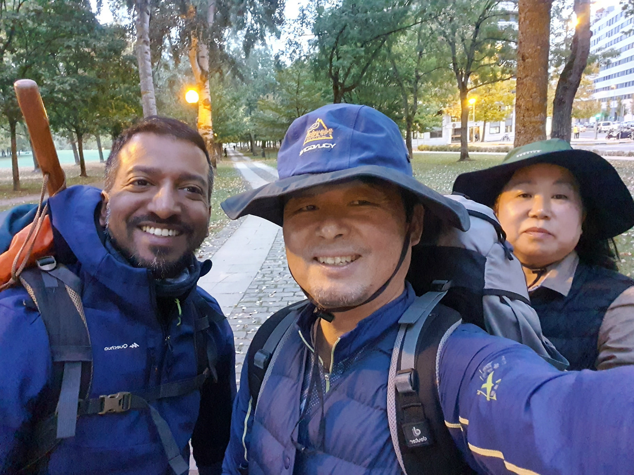 독일 순례자 조지를 처음 만난 것이 바로 이날, 택시를 타면서부터다. 앞에서 말했듯이 역무원이 부르는 대로 모여 서서 눈치를 보고 있는데 웬 까무잡잡하고 자그마한 외국인이 다가온다. 반백의 짧은 수염이 얼굴을 감싸고 있고 무술이라도 하는지 온몸에 균형 잡힌 근육이 적당한데 눈빛은 선하다. 단촐한 배낭을 지고 있는 모습이 누가 봐도 순례자인데 정작 내 눈을 끈 것은 그 배낭에 비스듬히 찔러 넣은 기다란 나무 지팡이였다. 제법 사연이 있을 법한 나무 지팡이를 어깨에서 반대편 정강이까지 대각선으로 매단 모습이 마치 전장으로 나가는 장수가 칼을 차고 있는 듯, 순간 스타워즈의 제다이가 떠올랐다. 피부색도 몸집도 다른데 분위기가 비슷했나 보다. 내 쪽으로 다가오는데 나도 모르게 말을 걸었다. 독일에서 왔고 세 번째 순례길이며 일주일만 걷고 돌아갈 예정이란다.