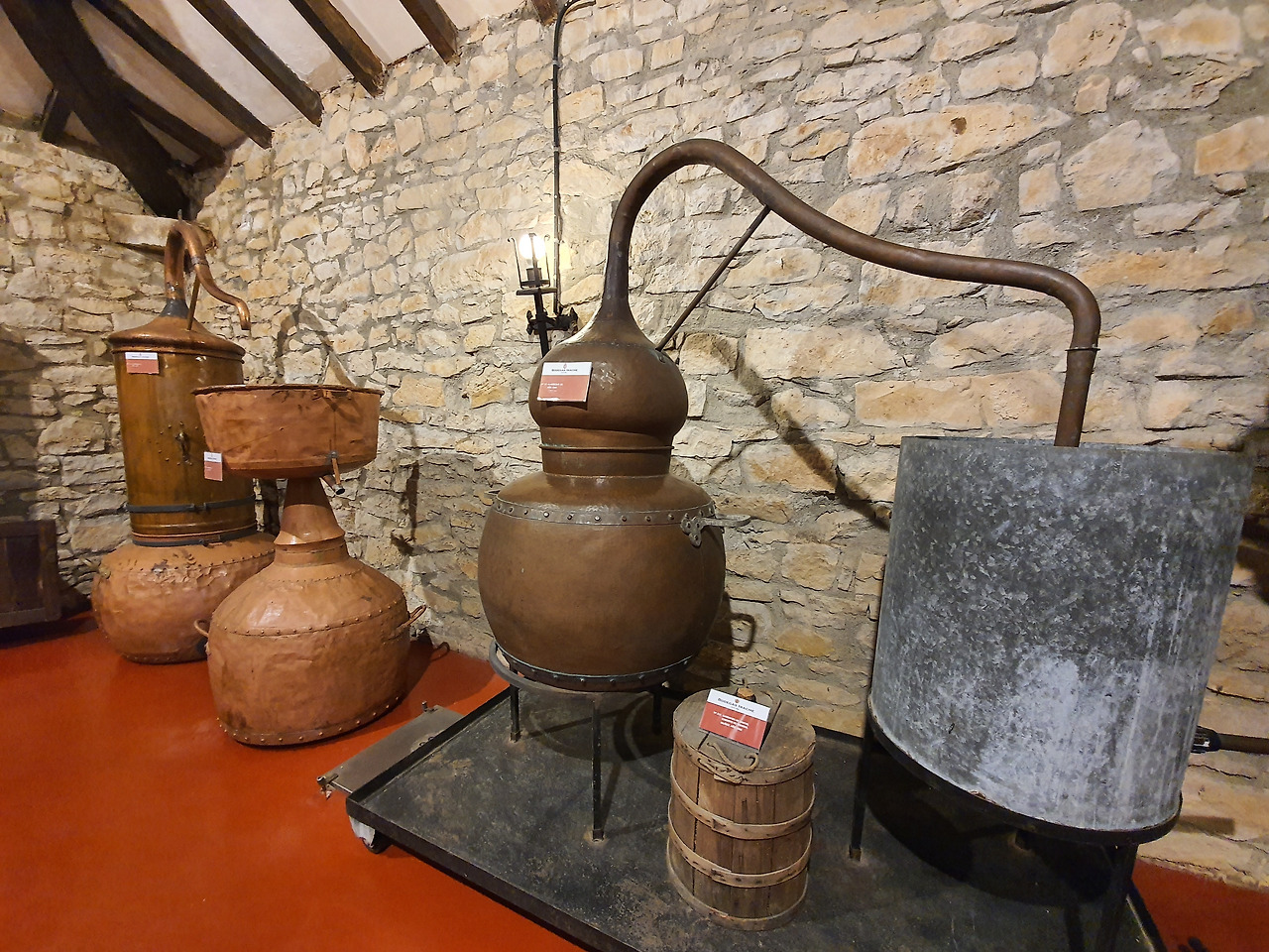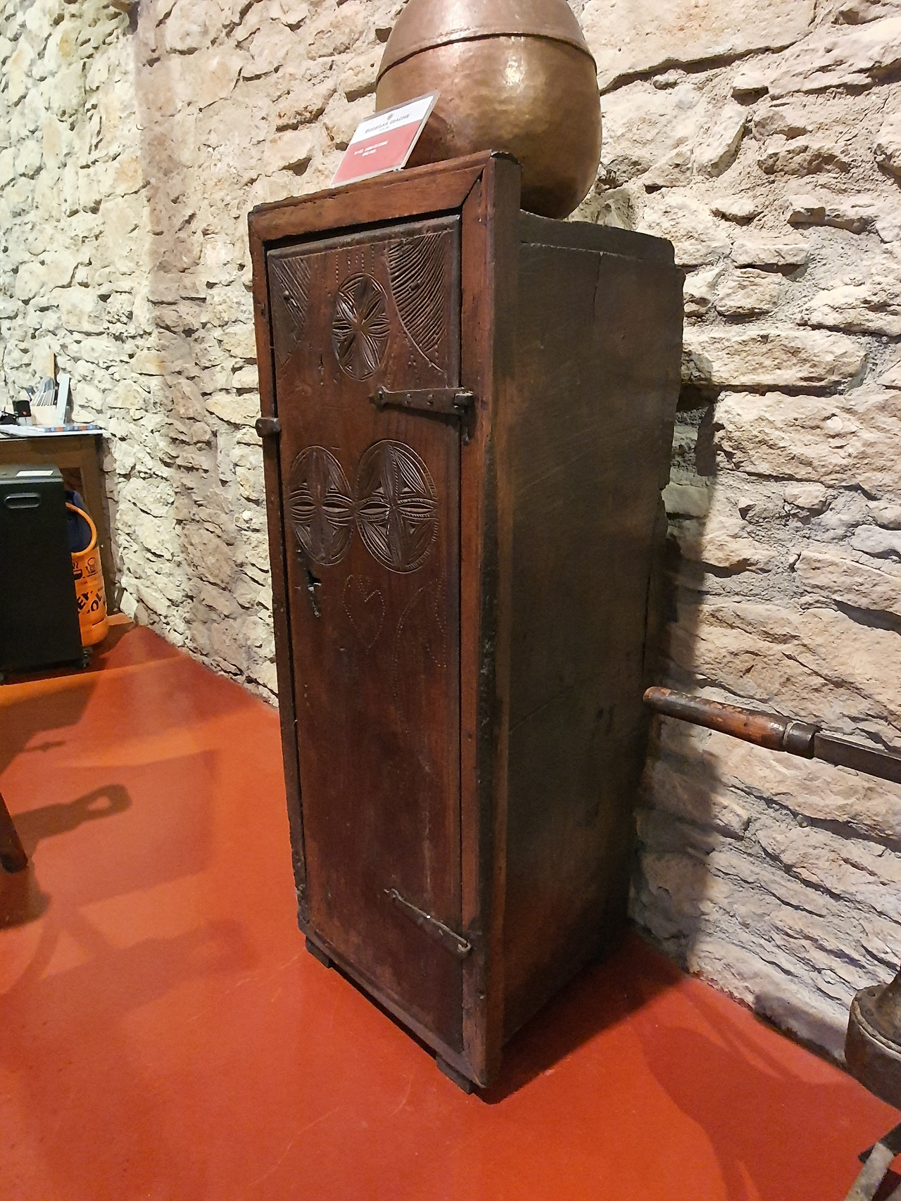 몇 걸음 옮기는데 마을 끝자락에 카페를 겸한 와이너리가 열려있다. 아무리 갈 길이 멀다고 해도 이걸 그냥 지나칠 수야 없지, 아내와 판쵸 우의를 벗어 놓고 안으로 들어갔다. 그리 넓지 않은 실내에는 옛날 와인을 만들던 기구들이 전시돼 있다. 구리를 두들겨 만든 증류기, 오크통처럼 나무를 이어 붙인 압착기 등에서 세월의 깊이가 느껴진다. 그러나 무엇보다도 자칭 목수인 내 눈을 끄는 것은 오래된 가구들이다. 캐비넷이며 테이블이며 찬장들이 전시돼 있는데, 모두 집성을 하지 않은 통판들, 두께 40mm정도의 두꺼운 판재로 만들어져 있다. 이렇게 가구를 만들려면 우선 두꺼운 나무를 구해야하고 건조를 잘 해야 한다, 최소한 몇 년 동안, 대충 건조했다가는 만들어 놓은 가구가 갈라지거나 틀어질 게 뻔하다. 나무끼리의 접합은 짜맞춤이 아니라 못과 접착제를 쓴 듯 보이고 표면도 대패질을 했으련만 매끈하지 못하다. 음각으로 문양을 새겼는데 이 또한 미적으로나 기술적으로 뛰어난 수준은 아니다.