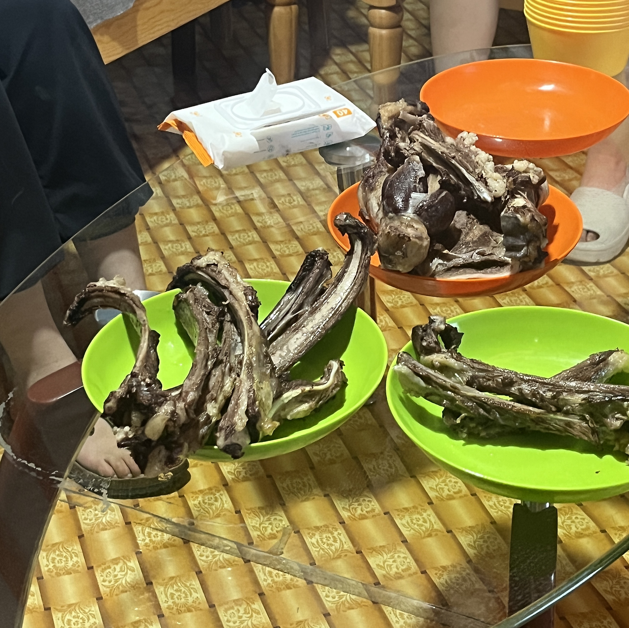 고비 사막을 지나면서는 양고기가 식탁에 계속 올랐다. 양념에 절인 양고기와 감자, 당근이 함께 나온 허르헉을 먹기도 하고 어쩌면 퓨전음식일지도 모른다며 양고기가 작게 썰린 고추장 볶음밥을 먹기도 했다. 퐁퐁과 개수대가 없는 여행지에서 식기구는 약간의 물과 물티슈로 닦여져 왔다. 덕분에 시간이 지날수록 컵에서도 포크에서도 양고기 냄새가 났다. 양고기 기름이 묻은 컵으로 커피를 마신 어느 날의 아침에는 멀미가 날 지경이었다. 그런데 오늘 저녁도 양고기라니..! 식탁에 둘러앉은 우리는 커다란 양 갈빗대를 멀뚱히 바라봤다.