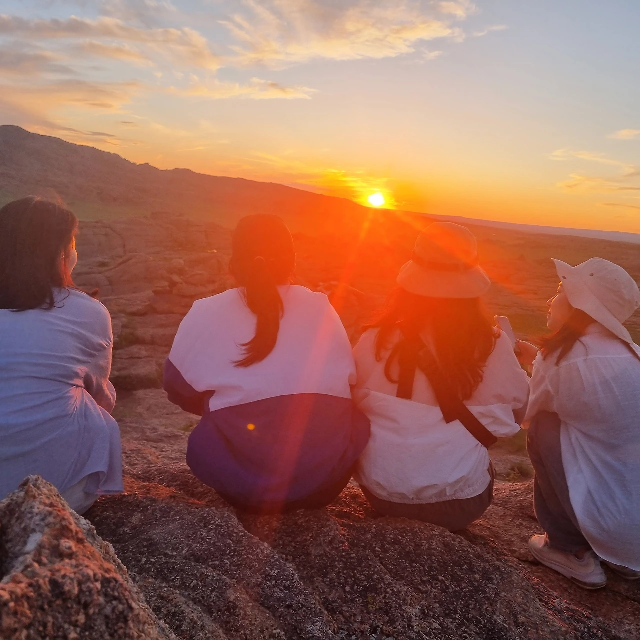 박자씨는 이번에도 수줍게 “이거 보여주려고 빨리 올라왔어요.”라고 말했다. 지는 해의 반대편에는 새하얀 갈비달이 높게 떠 있었고, 노을빛이 화강암 덩어리 사이사이를 붉게 물들이며 부드럽게 쓰다듬고 있었다. 해가 지평선에 걸쳐 남은 빛을 쏟아낼 때, 그 빛을 받은 땅 위의 풀들이 모두 반짝였다. 초원은 넓은데 노을빛은 더 환해서 저 멀리 땅 끝에 있는 풀잎도 볼 수 있을 것만 같았다. 바람은 선선하게 불고, 바위는 따뜻했다. 내 옆에 미미, 영이, 비니가 조로록 앉았다. 해가 완전히 져서 하늘이 청람색이 될 때까지 노을을 함께 바라봤다.