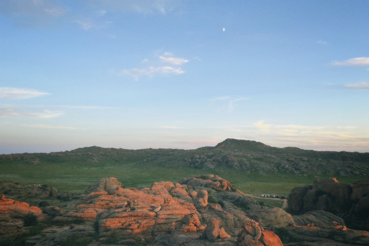 먼저 방문한 동굴은 겉보기에 충분히 신비로와 보였으나 굳이 들어가고 싶지 않았다. 밖에서 넓적한 바위 하나를 골라 엉덩이를 붙이고 앉았다. 친구들을 기다리며 화강암 지대와 하늘이 맞닿는 부분의 모양새를 찬찬히 바라봤다. 얼마 지나지 않아 동굴 구경을 마친 철, 태태, 미미, 영, 비니가 줄줄이 나왔다. 비니가 나와 같이 하늘을 보더니 “저거 상현달이지.” 말했다. 내가 그래 맞아 상현달이야 맞장구를 쳤다. 가이드 박자씨도 껴들어 “저건 갈비달이라고 해요.” 말했다. 둥근 보름달을 갈비처럼 뜯어먹어 갈비달이란 말인가. 고기를 주로 먹는 몽골의 달 이름으로 그럴듯하다는 생각을 했다.