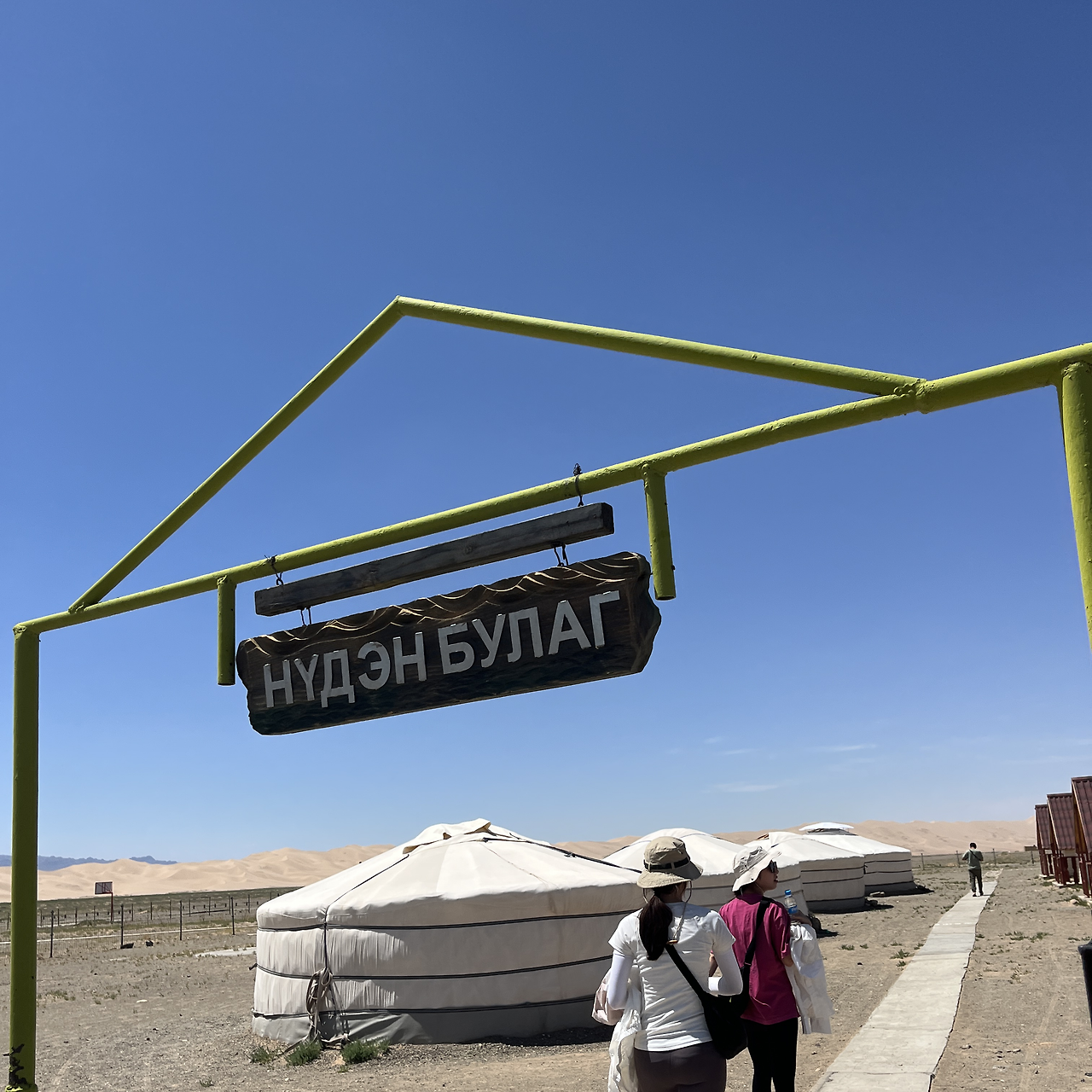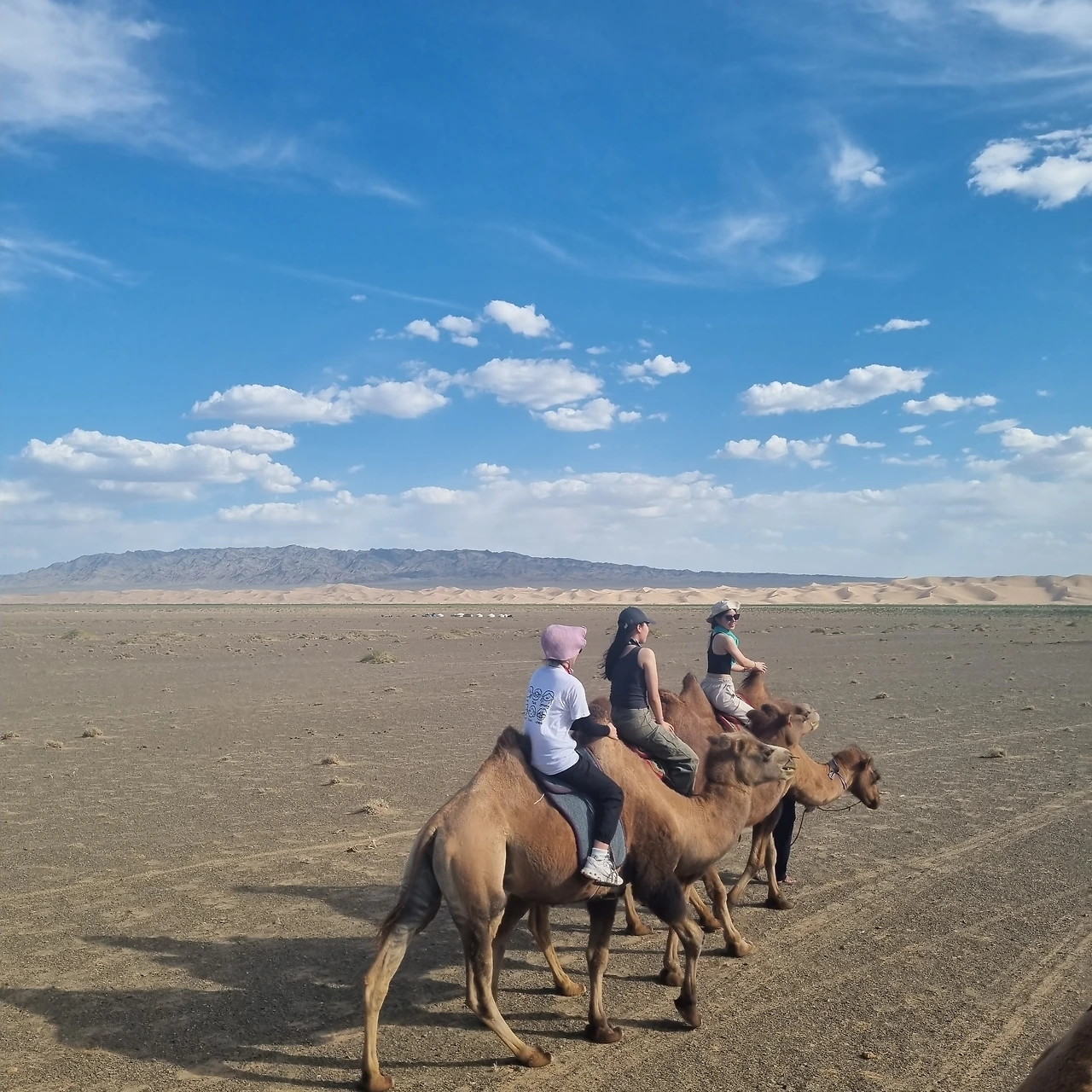 말은 세단, 낙타는 달구지라고 표현할 정도로 낙타의 승차감은 좋지 않기로 유명하다. 내가 탄 작은 낙타는 아주 어린 낙타 같았다. 다른 늙은 낙타들과는 다르게 혹이 탄력있고 털이 부드러웠다. 욜린암에서 작은 말을 배정 받았을 때와 마찬가지로 이 어린 낙타도 일하기 싫어한다는 것이 느껴졌다. 가기 싫은 티를 팍팍 내며 걸어가는 것이었다. 어쩜 이렇게 눈치를 주며 걷는 방법을 알고 있을까 싶었다. 크기가 큰 성체로 보이는 낙타들은 이 직업에 순응하였는지 안정적으로 묵묵히 걸어갔다. 모래 길을 걷는 내내 높은 낙타 등 위에서 떨어질까 무서웠다. 따뜻하고 기름진 낙타의 혹을 꽉 잡았다. 잡은 손에 땀이 찼다.