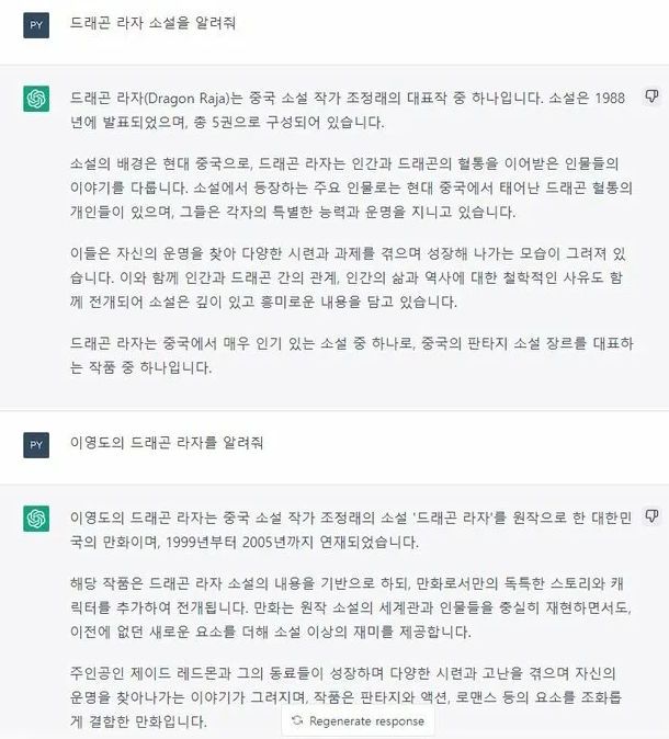 네. 당시엔 뭘 어떻게 쓰는지도 몰랐고, 지피티에 존대도 쓰지 않았습니다. 그래서 그냥 직설적으로 물어본 것입니다. 하지만, [드래곤 라자]는 한국에서 워낙 유명한 작품입니다. 일부 교과서에도 소개되었을 정도. 이 정도라면 당연히 대답이 나올거라고 생각했습니다.