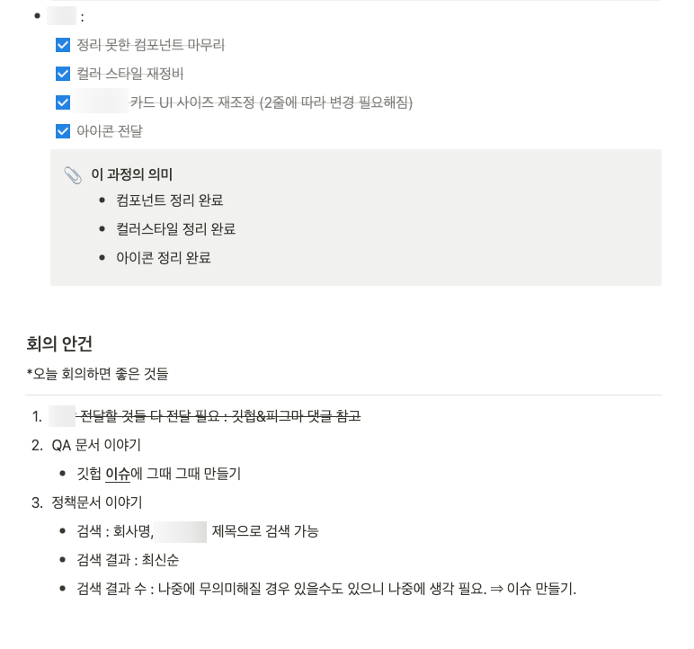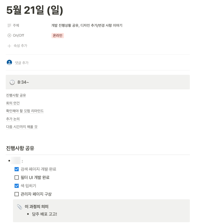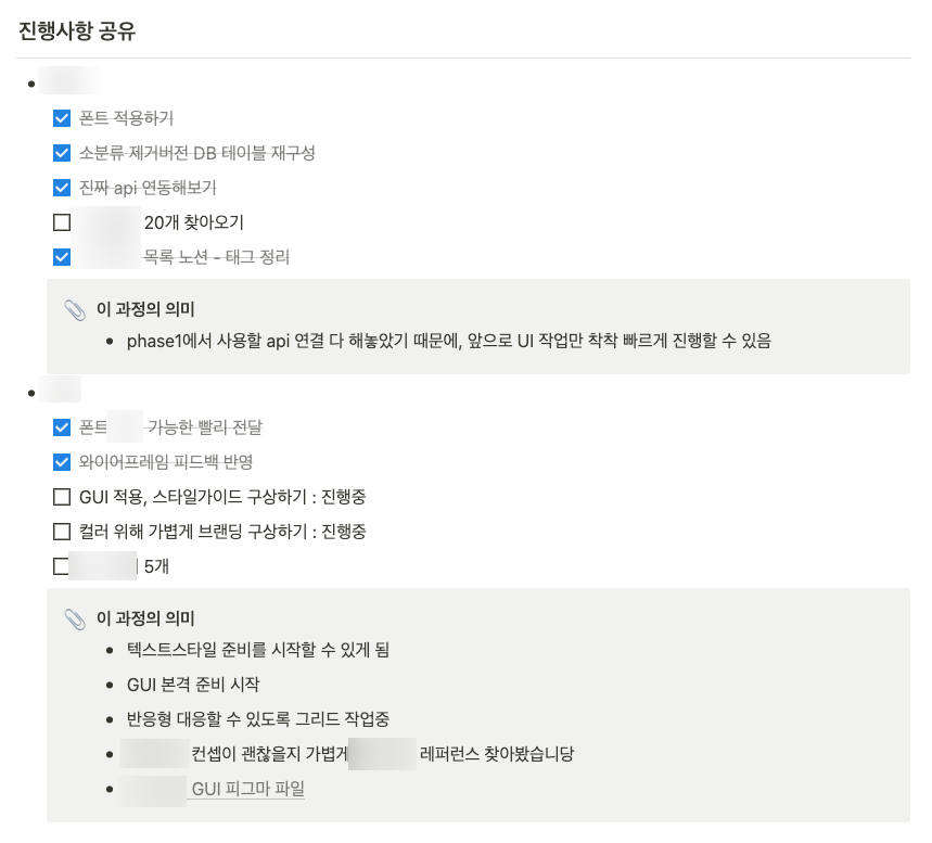 이 부분이 결국 다음 회의록에서 진행상황 공유의 체크박스에 들어가는 부분이다. 같이 앞으로의 진행 상황을 점검하는 겸, 다음 시간 목표를 정할 수 있다. 그리고 각자 다음 회의시간이 되기 전 작업할 때 '나 뭐해야 했지' 하고 우왕좌왕하는 시간낭비를 줄일 수 있다.