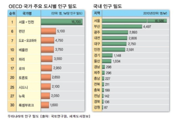 그림에서 설명되는 것은 서울의 인구 밀도이다. 전 세계에서 단연 1등이고 우리나라에서도 서울은 1등이다. 면적만 가지고 계산을 한 것이라 집을 지을 수 있는 토지만을 계산한다면 밀도는 2배 이상 올라갈 것이다. 우리가 초등학교 때 배웠듯이 국토의 70%가 산으로 되어있는 나라이다. 외국인들이 서울에 오면 산과 건축이 어우러진 서울이 아름답다고 하지만, 우리 입장에서는 산이 많아 주택을 지을 땅이 없는 서민들이 살기 어려운 도시인 것이다.