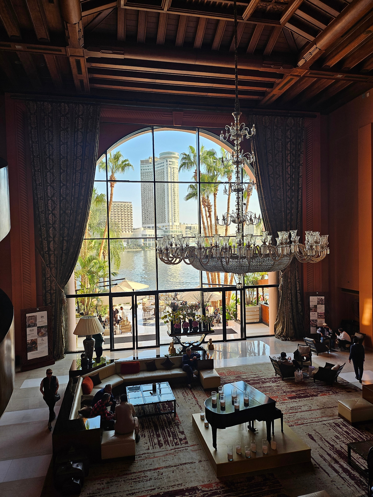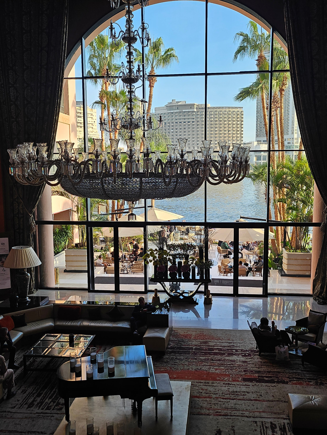 뮤지컬 오페라의 유령의 시그니처인 극장 샹들리에를 연상시키는 호텔의 샹들리에는 절묘하게 통창과 조화를 이루며 이집트의 이국적인 전경을 돋보이게 했다.