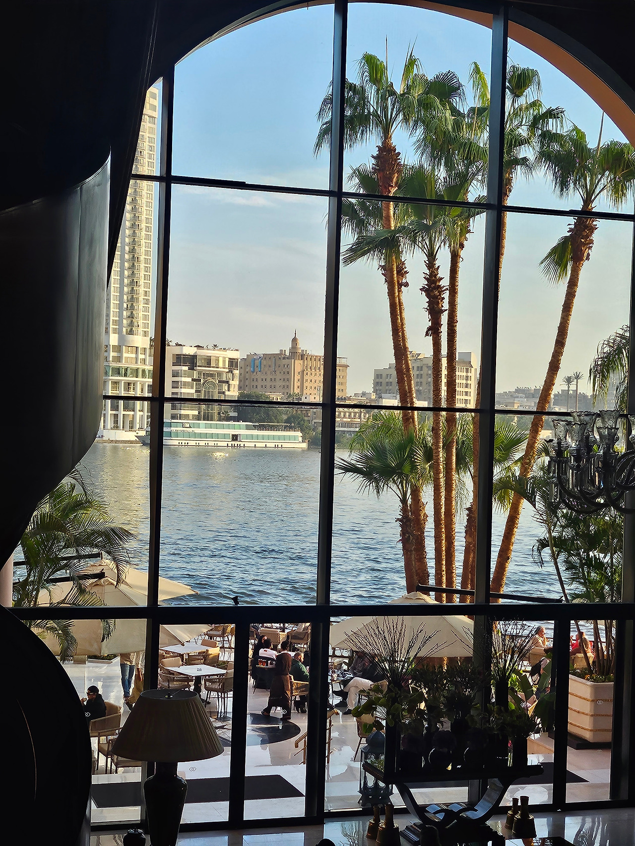 사진을 다시 보니 '익숙함'의 정체는 멋진 샹들리에였고 '편안함'의 정체는 창밖으로 보이는 나일강인가 싶다.