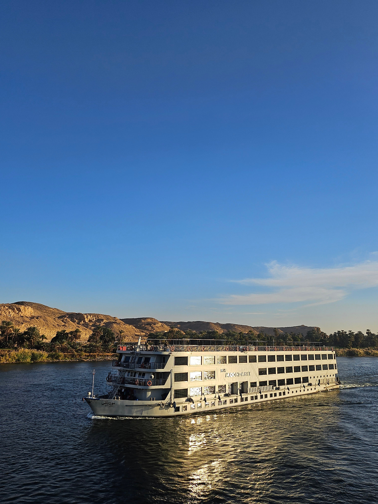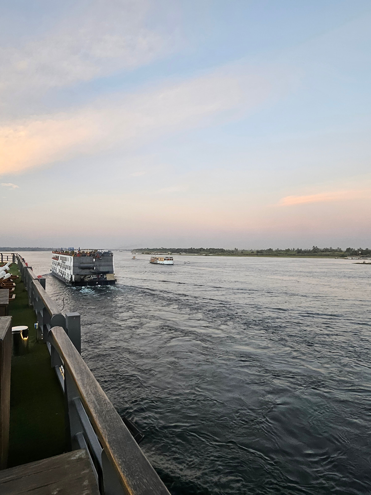 아부심벨에서 아스완까지 크루즈로 여행하면서 나일강의 아름다움을 만끽했다. 크루즈들이 줄지어 가면서 한가로이 떠가는 모습이 장관이다. 선상에 있는 수영장과 바 (bar)에서 햇빛을 즐기는 사람들과 서로 손 흔들며 인사도 나누고 선 베드에 누워 나일강의 바람에 몸을 맡겨두기도 했다. 나일강을 따라 줄지어 이동하는 크루즈들을 신기하게 바라보며 노을이 지는 나일강을 바라보느라 시간이 가는 줄 몰랐다. 선상에서 한참을 있었는데 생각보다 바람이 차가워서 아쉬움을 뒤로하고 선실로 내려와야 했다.