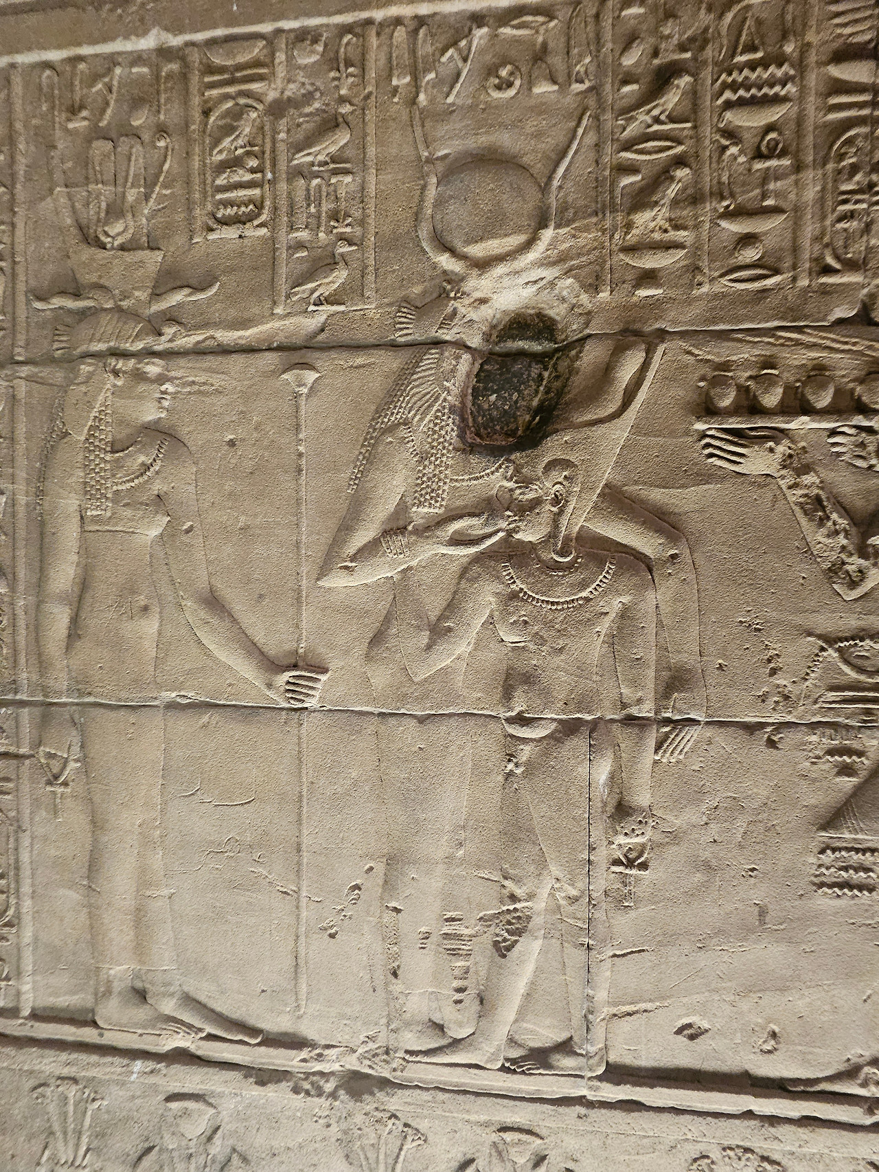 신전 내부에는 하토르 여신에게 봉헌하는 파라오가 새겨져 있다. 오른쪽 벽화에는 어린 파라오에게 음식을 먹이는 하토르 여신이 있는데 얼굴이 심하게 손상되어 있다. 사랑과 출산의 여신인 하토로의 얼굴을 만지면 아들을 낳는다는 전설이 있어서 많은 사람들의 손길에 이렇게 손상이 되었다고 한다.믿거나 말거나!