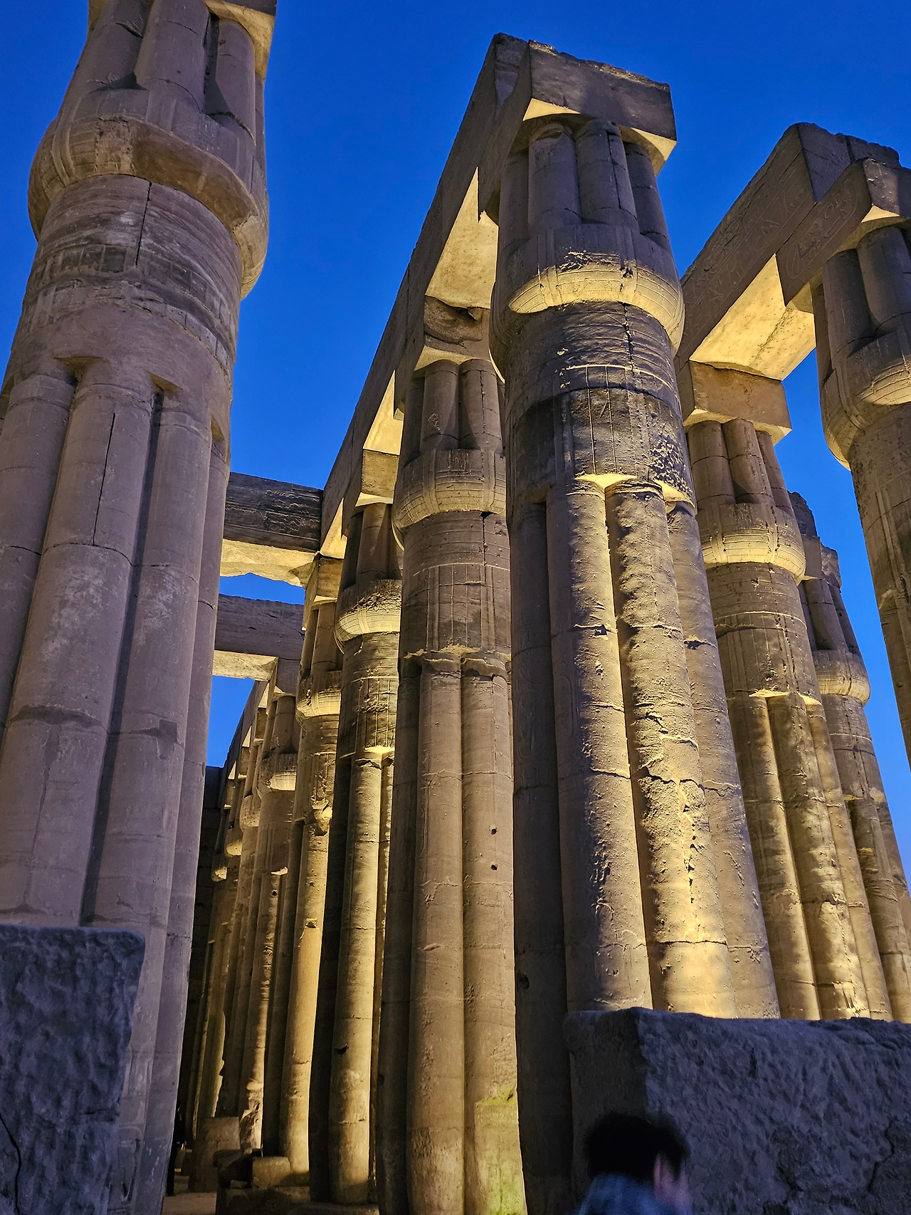 왼쪽의 필레 신전의 내부 기둥과 오른쪽 카르낙 신전의 외부 열주의 기둥 모양을 보니 시대 흐름에 따른 건축양식의 변화를 확실히 알 수 있다. 카르낙 신전은 신왕국 시대 (기원전 1550년 ~ 기원전 1077년) 제19왕조 람세스 왕이 건축을 시작하여 프톨레마이어스 왕조까지 오랜 시간 동안 건축된 최대 규모의 신전이다. 카르낙 신전의 열주는 제19왕조 때 건축되어 이집트의 전형적인 파피루스 양식의 기둥으로 세워졌다. 반면 필레 신전은 한참 후인 헬레니즘 시대 (프톨레마이오스 왕조, 기원전 332 ~ 기원전 30년)에 건축되어 코린트식 건축양식을 가지고 있다. 이집트의 유적들은 신과 파라오들의 스토리도 매우 흥미롭지만 고대미술사 관점에서도 공부할 것들이 무궁무진하다. 왼쪽의 필레 신전의 내부 기둥 사진을 자세히 보면, 절단된 흔적을 볼 수 있는데 신전을 이전하기 위해 정교하게 기둥을 자른 후 일련번호를 붙여 이동시킨 후 복구한 역사적인 기록이다.