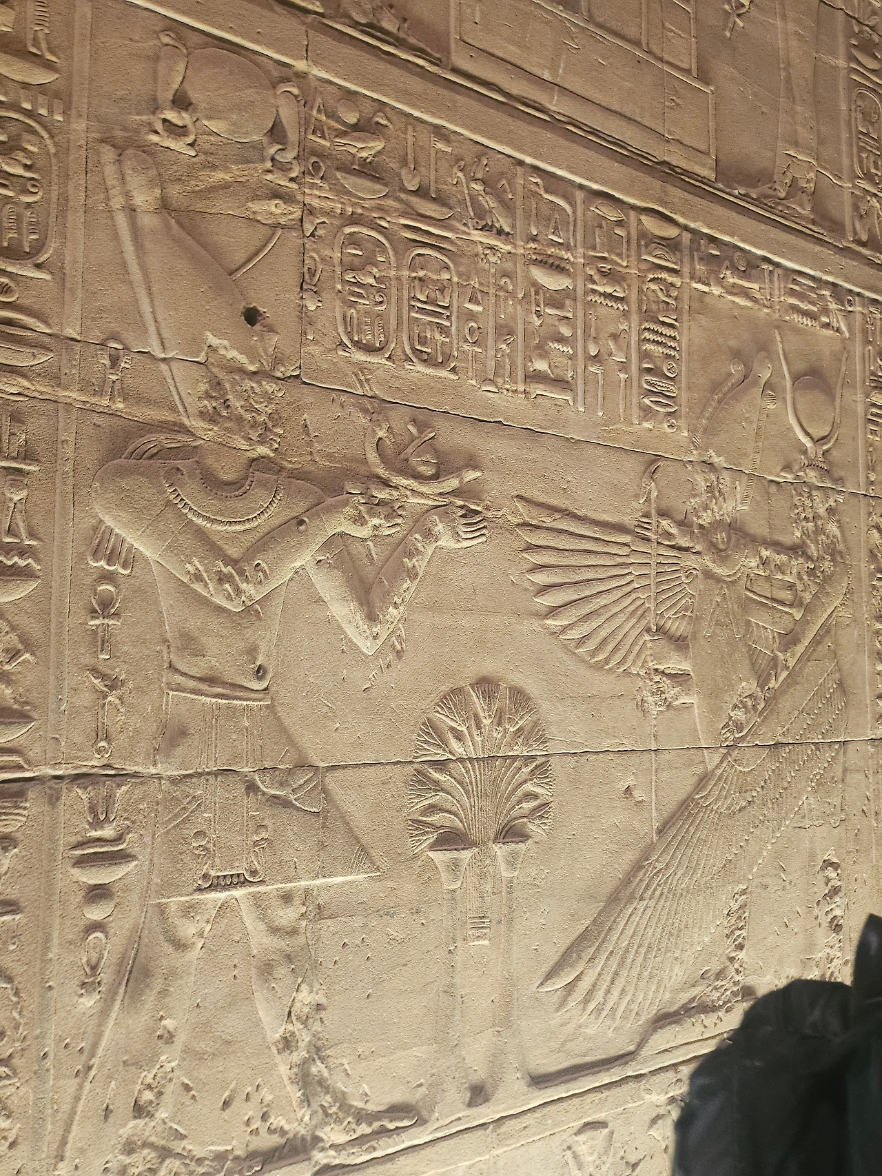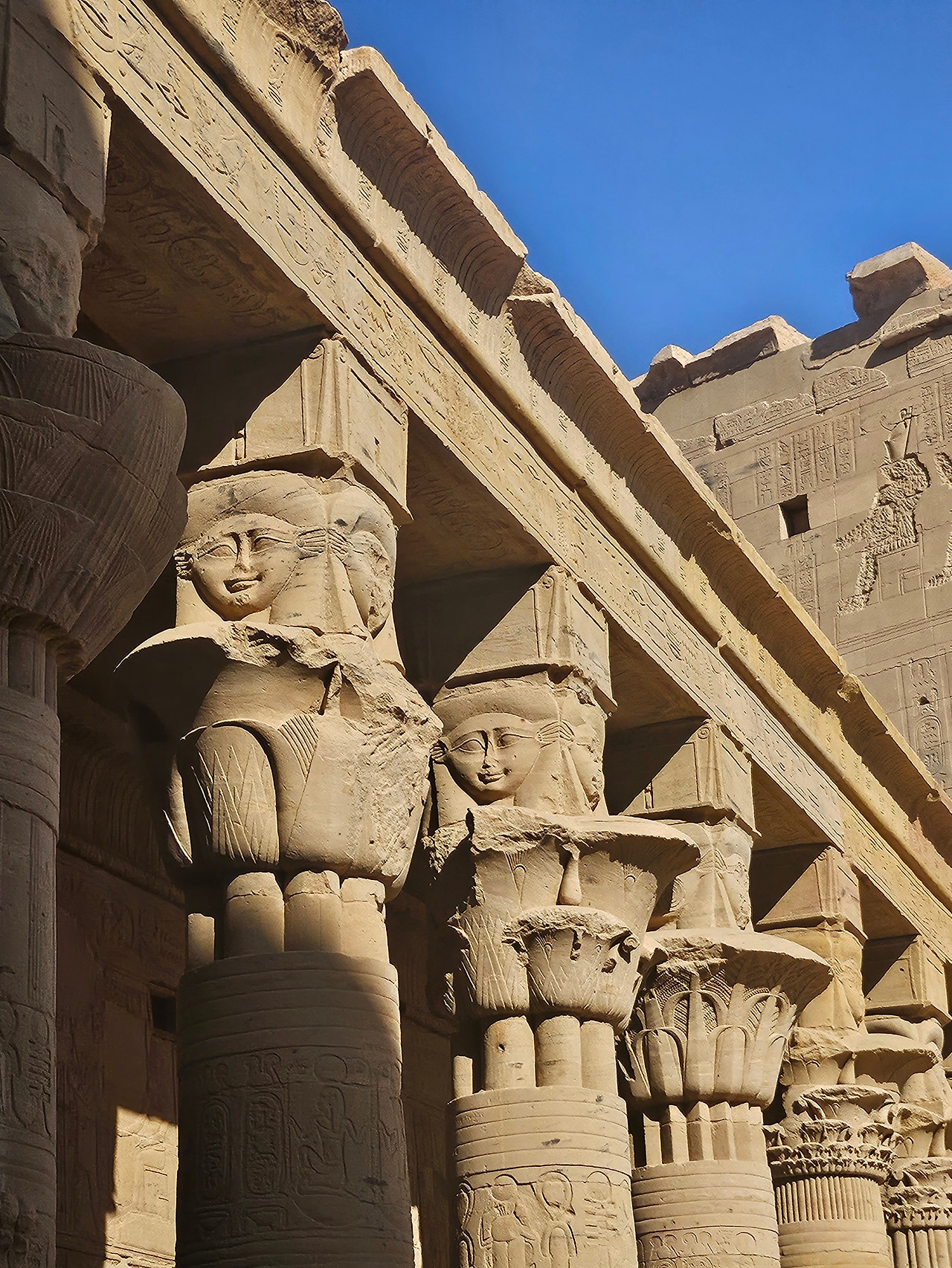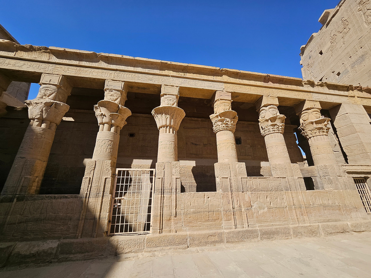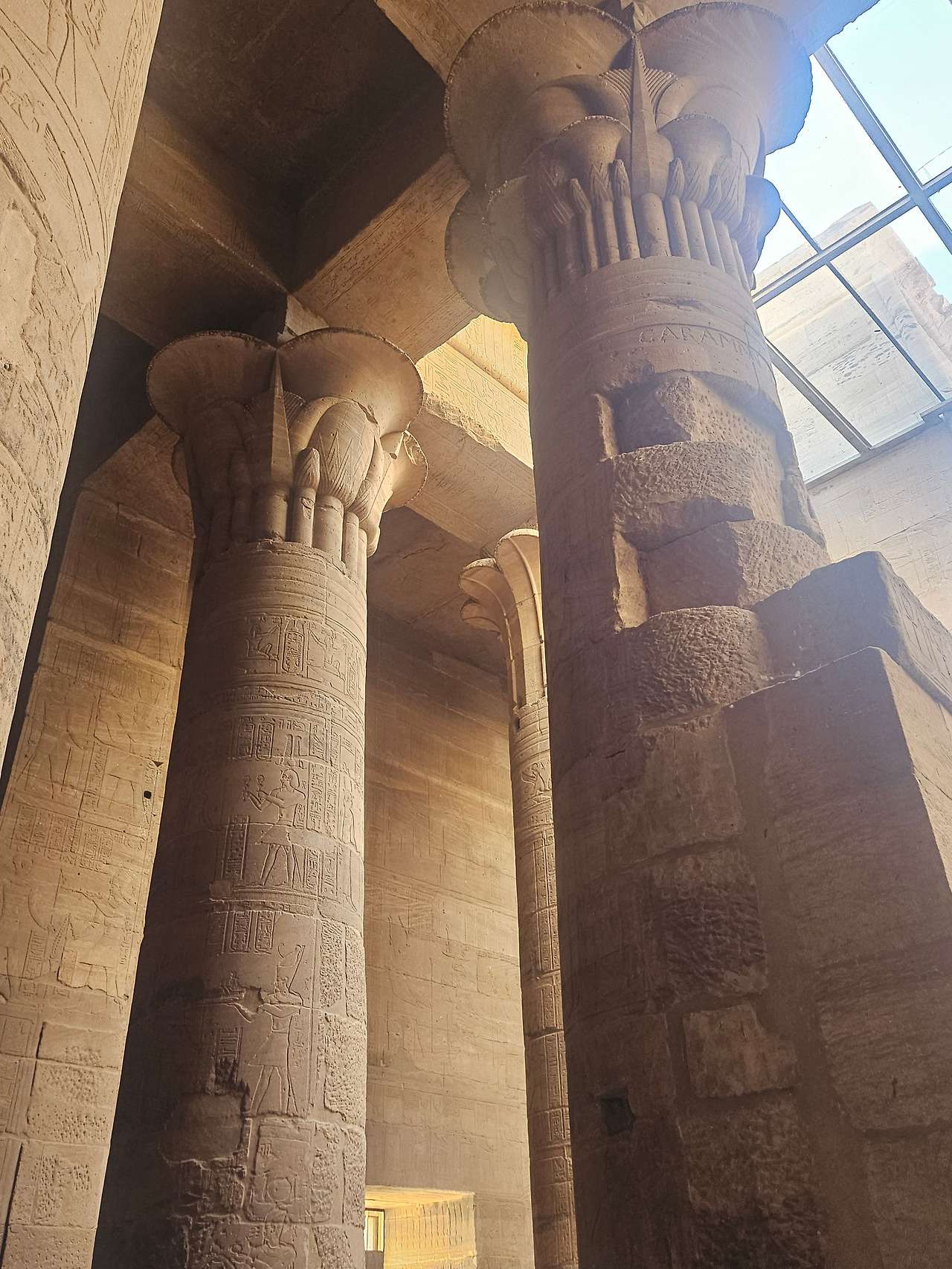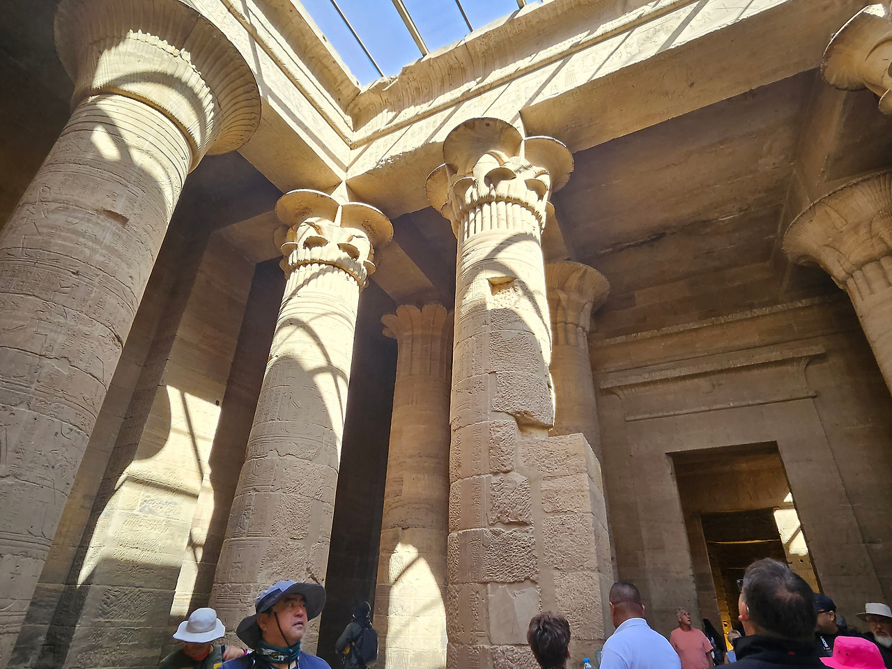 필레 신전에 들어서서 보이는 열주들은 이집트 양식 중 대추야자잎 모양의 기단으로 보였다. 재미있는 건 기둥의 모양들이 다양하게 섞여 있었다. 꽃잎 모양이 여러 개 둘러싼 기둥, 하나의 잎이 둘러싼 기둥 등이 있었는데 무엇보다 다른 것은 천장을 받친 기단 맨 위에는 하토르 (Hathor) 여신의 얼굴이 새겨져 있었다. 가이드가 프톨레마이어스 왕조는 그리스 헬레니즘의 영향을 받아 코린트식 건축양식을 볼 수 있다고 한다. 일반적으로 알고 있는 그리스식 기둥은 도리아 양식, 이오니아 양식, 코린트 양식이 있다. 뒤로 갈수록 장식이 많아져서 화려하다. 신전 내부의 기둥은 확실히 코린트 양식으로 보이는 기둥들이 늘어서 있었다.