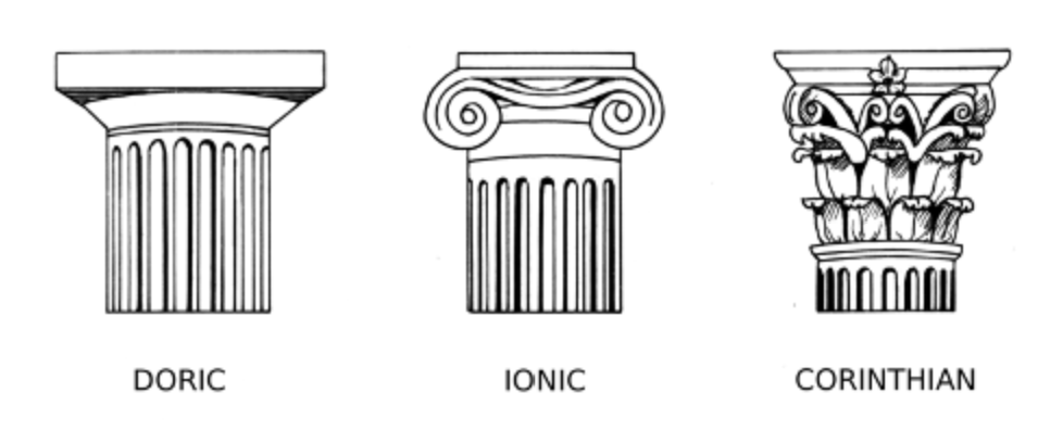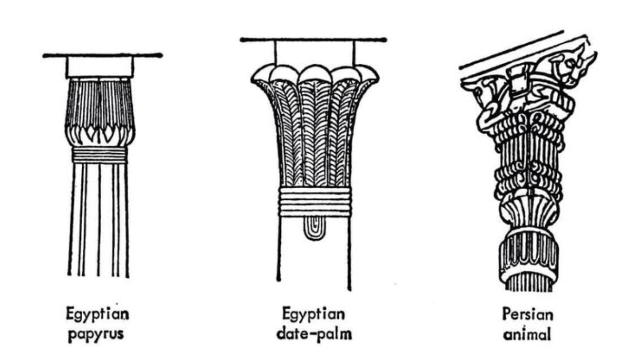 이집트 양식 (파피루스, 대추야자입, 페르시안 동물) vs. 그리스 양식 (도리아식, 이오니아식, 코린트식)